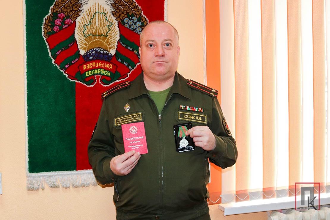 Гэта першая дзяржузнагарода Мікалая Мікалаевіча, хоць медалёў ён мае нямала — ажно 12, але ўсе яны юбілейныя. За 29 гадоў службы сабраўся і цэлы стос розных грамат і падзяк, у тым ліку міністра абароны, начальніка Генеральнага штаба Узброеных Сіл, камандуючага войскамі супрацьпаветранай абароны і інш. Частка з іх цяпер упрыгожвае сцяну рабочага кабінета.