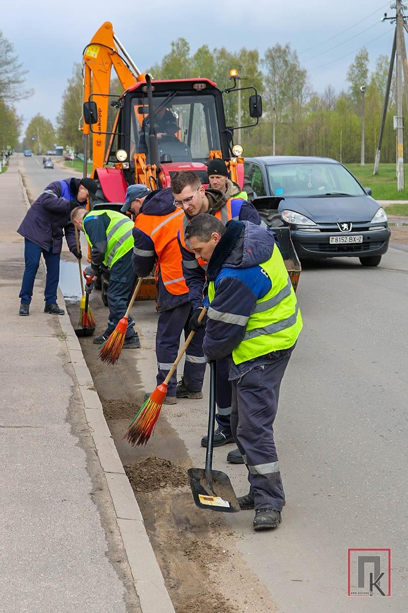 Не спыніцца ля работнікаў Пастаўскага раёна газазабеспячэння было немагчыма: яны ў форменным адзенні і спецыяльных камізэльках прыбіралі вуліцу 17 Верасня, на якой размяшчаецца іх прадпрыемства. Змяталі пясок у кучкі, грузілі ў экскаватар.