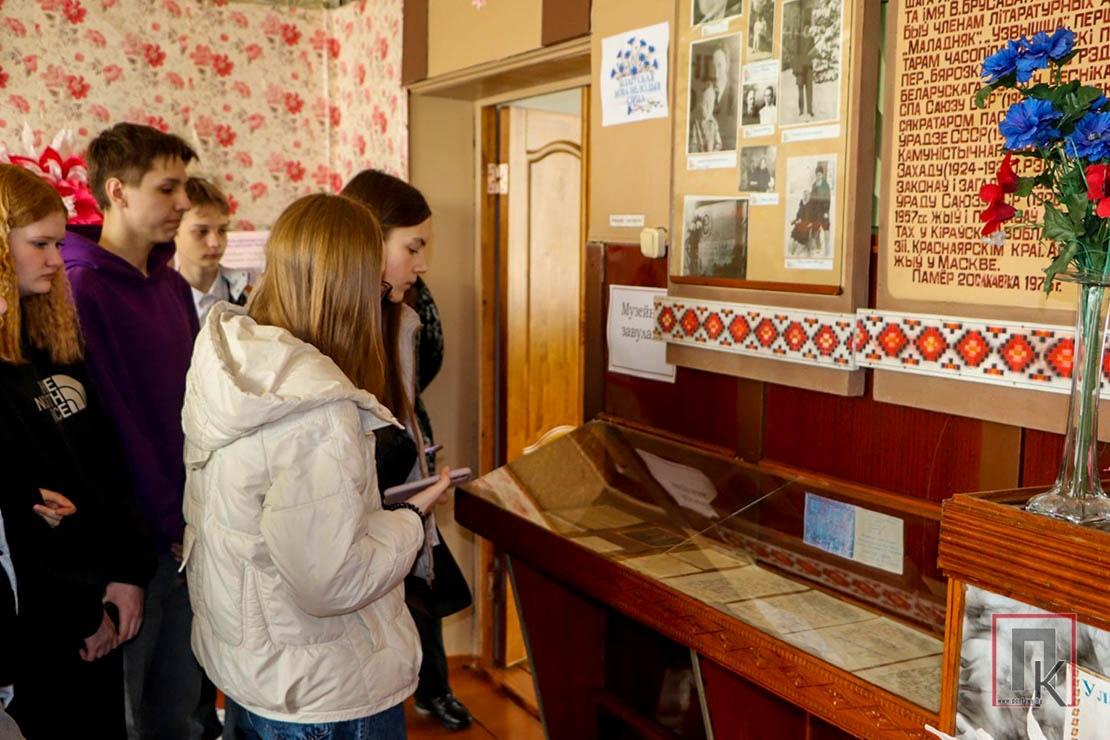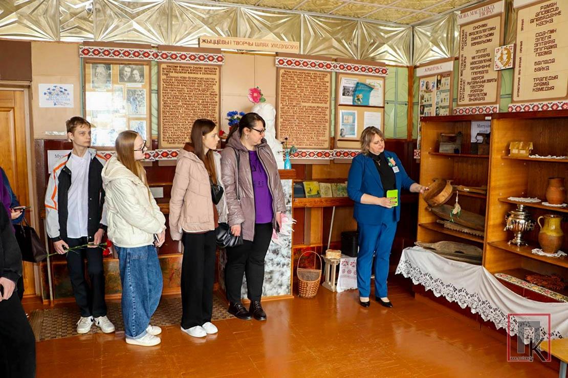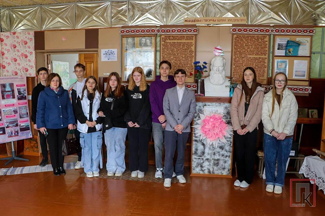 Первая остановка состоялась в Юньках. Там группу встречала заведующая детсадом Раиса Сороко. Она провела участников маршрута по музейному уголку памяти знаменитого земляка — писателя, языковеда, переводчика, литературного критика Владимира Дубовки. Ко многим экспонатам, сохранившимся до сегодняшнего дня, ребята смогли прикоснуться, подержать их в руках. Один из них — кожаный портфель, когда-то принадлежавший великому классику. Затем все вместе отправились к памятнику погибшим землякам во время Великой Отечественной войны, установленному в центре агрогородка, чтобы почтить память о них и возложить цветы.