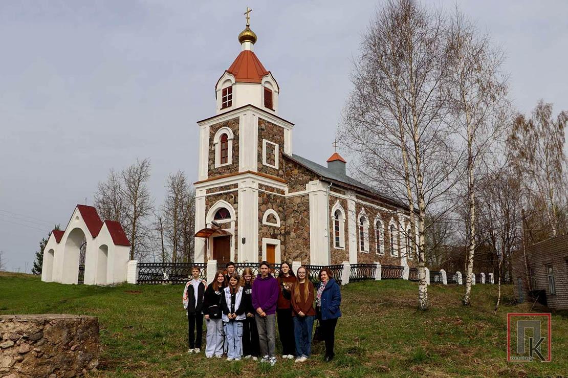 Церковь Рождества Иоанна Предтечи в Груздово — следующая точка краеведческого маршрута. Храм является памятником архитектуры ретроспективно-русского стиля и относится к Поставскому благочинию. Внутрь ребята попасть не смогли, поскольку он был закрыт. Зато с удовольствием прогулялись вокруг церкви и восхитились её необычной архитектурой. С интересом слушали увлекательный рассказ руководителя проекта о том, как возникло название деревни, как в своё время здесь зародились уникальные диатонические цимбалы и как когда-то на всю округу славился ансамбль груздовских цимбалистов. Сфотографировавшись, группа отправилась по маршруту дальше.