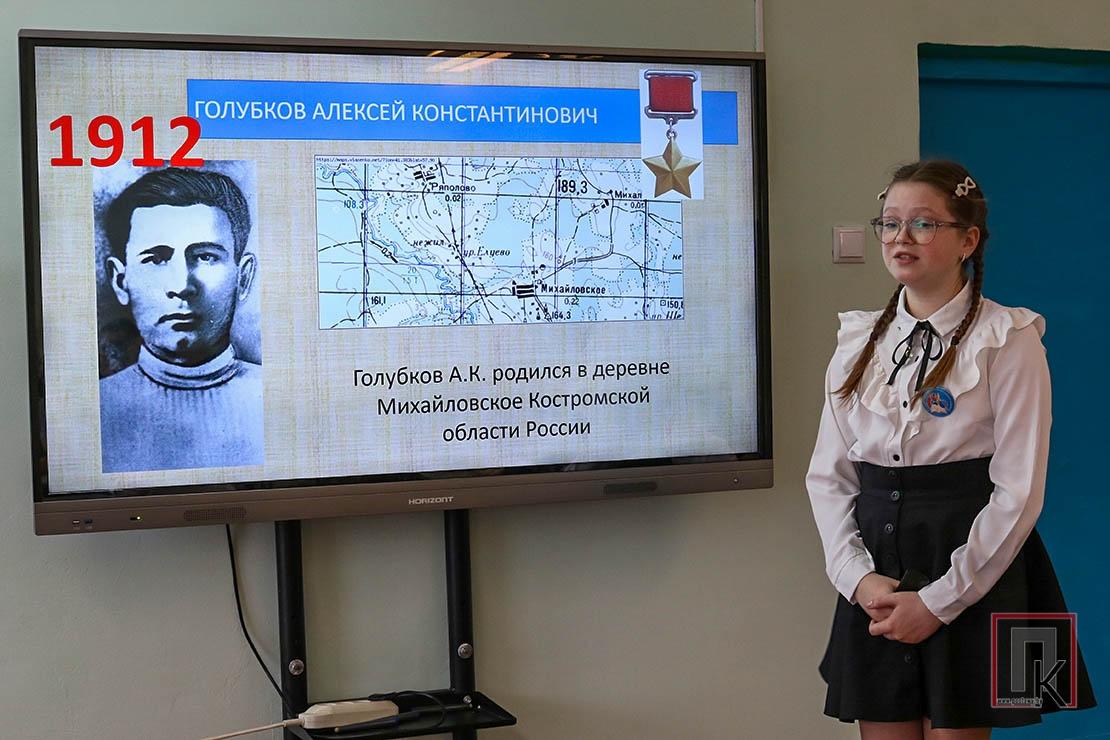 Пра ўсё гэта гаварылася падчас сустрэчы ў Лынтупскай СШ. З біяграфіямі герояў вучняў школы і гасцей, сярод якіх былі старшыня мясцовага Савета дэпутатаў Аляксандр Макаранка, жыхаркі вуліц Галубкова і Красільнікава Нэлла Іваніна і Алена Салянікава, пазнаёмілі 7-класніцы Віялета Свірбутовіч і Вікторыя Рогач, 6-класнік Андрэй Пазняк. Затым слова далі гасцям. Аляксандр Яўгеньевіч падзякаваў школьнікам за штогадовую дапамогу ў навядзенні парадку каля помнікаў загінулым у гады Вялікай Айчыннай вайны, зазначыўшы: «Мы павінны памятаць усіх, хто аддаў за нас сваё жыццё». З такім жа пасылам звярнулася да навучэнцаў карэспандэнт тэлеканала «Паставы ТБ» Наталля Семянас. Дырэктар раённага краязнаўчага музея Аляксандр Кузняцоў выказаў удзячнасць дзецям і педагогам за падрыхтаваную прэзентацыю. А Нэлла Іваніна расказала пра тое, як ёй жывецца на вуліцы, названай імем героя.