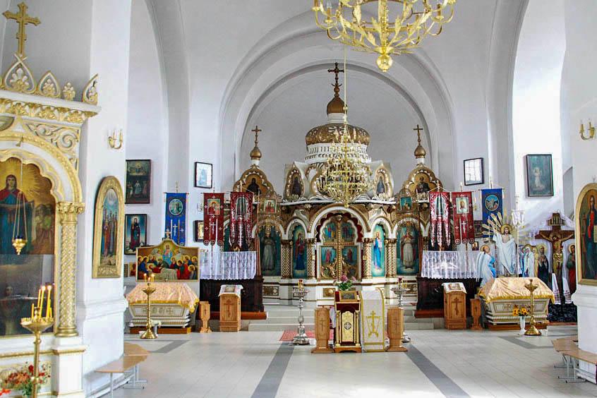 Внутренняя отделка храма необычная: притягивает внимание сень над престолом в виде голубого неба, завершающаяся шатровым куполом с крестом. Всё это создаёт впечатление храма в храме. Наверху иконостаса размещены вырезанные из дерева головки ангелов с крылышками, покрытые золотой краской. Художественную ценность представляют иконы «Праотец Авраам», «Матфей и Павел», «Архангел Гавриил», «Архангел Михаил», «Тайная вечеря». Уже в ХХ столетии псаломщиком Иваном Окуличем написаны иконы «Успение Пресвятой Богородицы» и «Воскресение Христа». Киоты икон Николая Чудотворца, Александра Невского, Покрова Пресвятой Богородицы, Виленских мучеников Антония, Иоанна и Евстафия выполнены необычайно красивой резьбой по дереву и радуют глаз изяществом и лёгкостью.