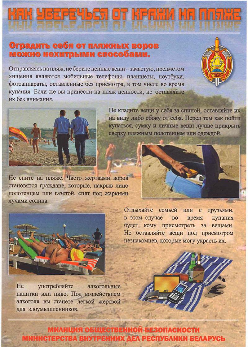 Также довольно часто происходит так, что увлекшись отдыхом и купанием в прохладной воде в знойный день, люди оставляют без присмотра свое имущество, в том числе и дорогостоящие телефоны, фотоаппараты и иные ценности. Этим могут воспользоваться «нечистые на руку» люди и похитить их. Поэтому, не оставляйте свое имущество без присмотра, соблюдайте законодательство Республики Беларусь и правила поведения на водах и Ваш отдых будет приятным и безопасным.
