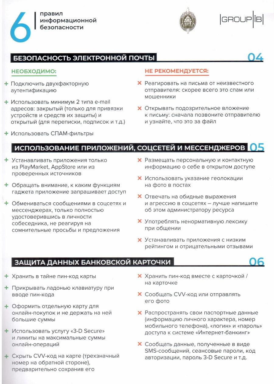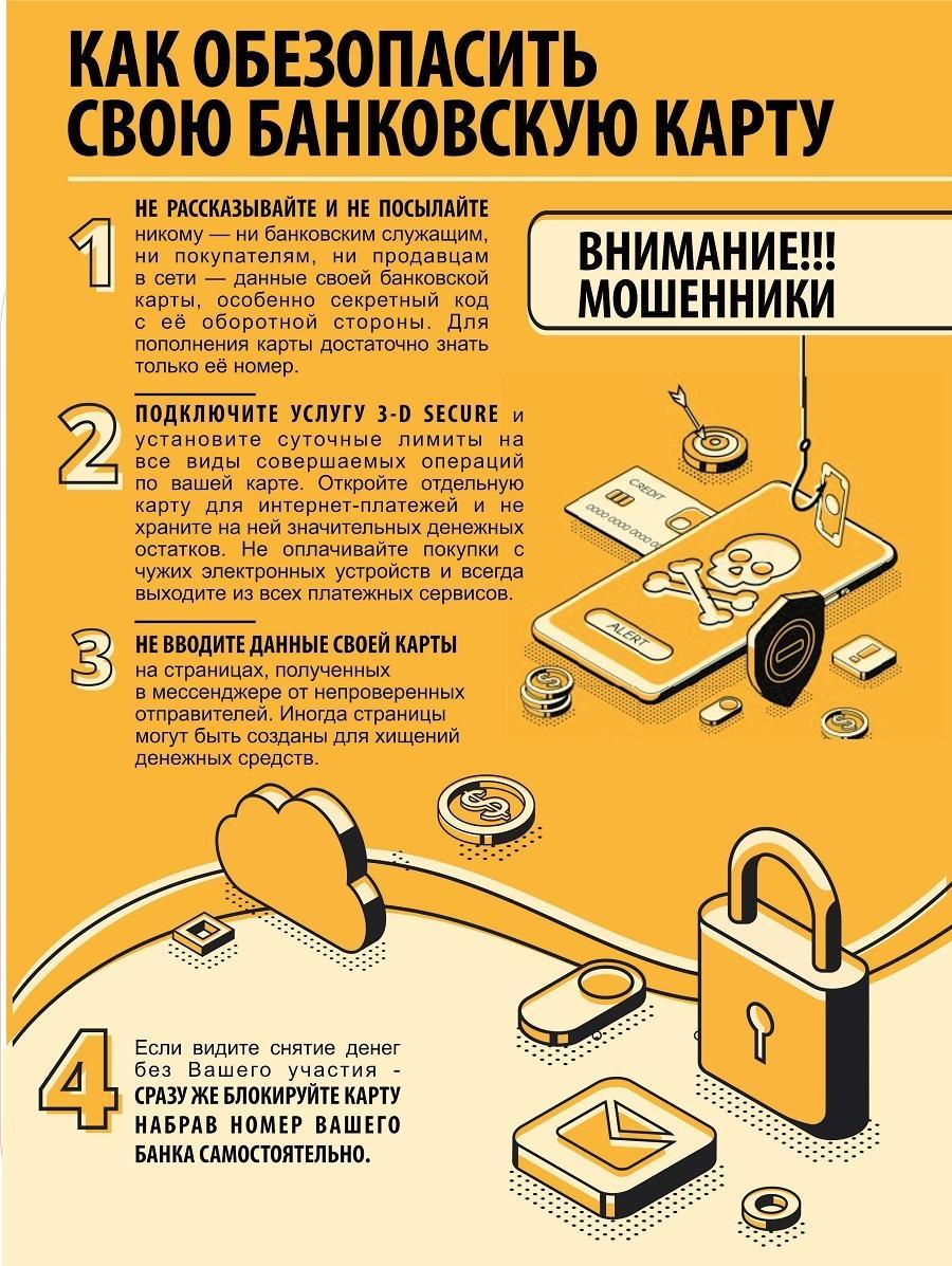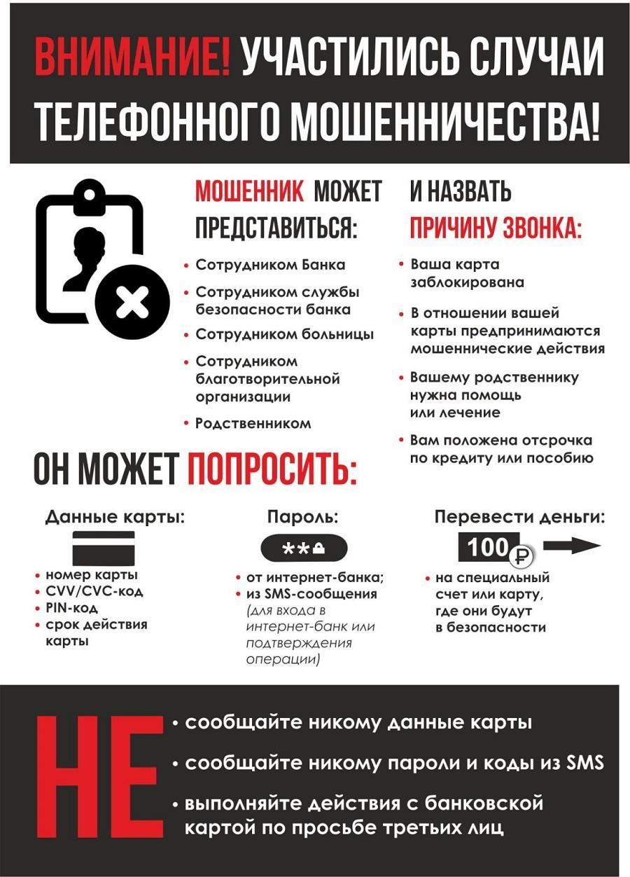Никому ни под каким предлогом не передавать номер банковской платежной карты, срок действия, трёхзначный секретный код на обороте, логины и пароли доступа к банкингу, коды для подтверждения операций из смс-сообщений от банка.