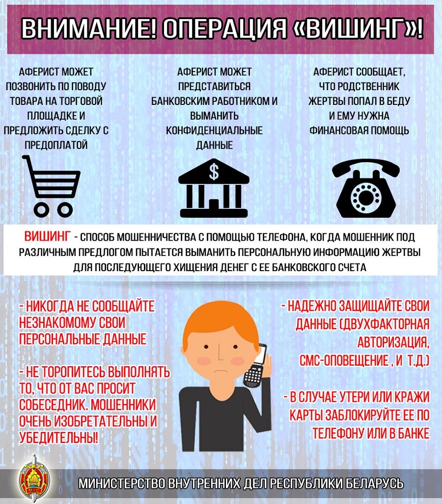 «Вишинг» – один из методов мошенничества, который заключается в том, что злоумышленники, подменяя реальный номер телефона на номер телефона банка, и выдавая себя за сотрудника банка или правоохранительных органов под предлогом отмены операции (отмены онлайн-кредита, возврата случайно списанной суммы или разоблачения недобросовестного сотрудника банка) выманивают у держателей платежных карт конфиденциальную информацию – номер, срок действия, трехзначный код на обороте – или побуждают к установке программного обеспечения (удаленного доступа) для действий с интернет- или м-банкингом.