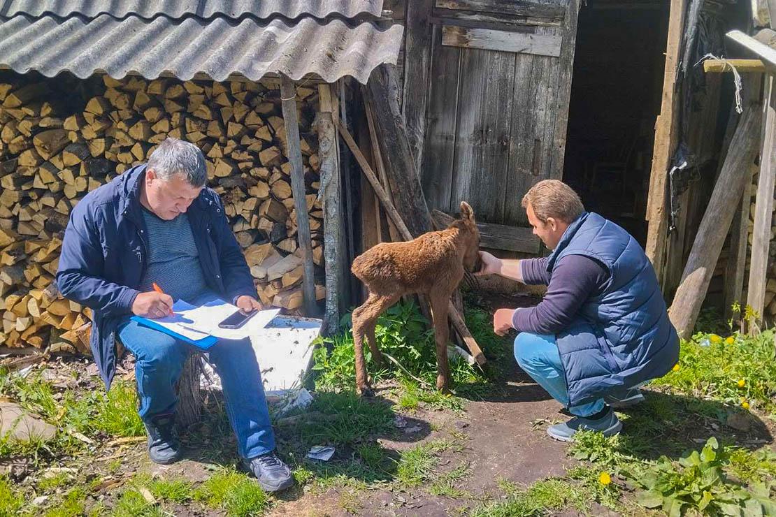 Визуальный осмотр лосёнка показал: ему 7-9 дней от роду, это самец, без травм, но с лёгким истощением. Малышу необходимы особый уход и кормление. Чтобы не навредить здоровью животного, его напоили кипячёной подслащённой водой и вывели греться на солнце.