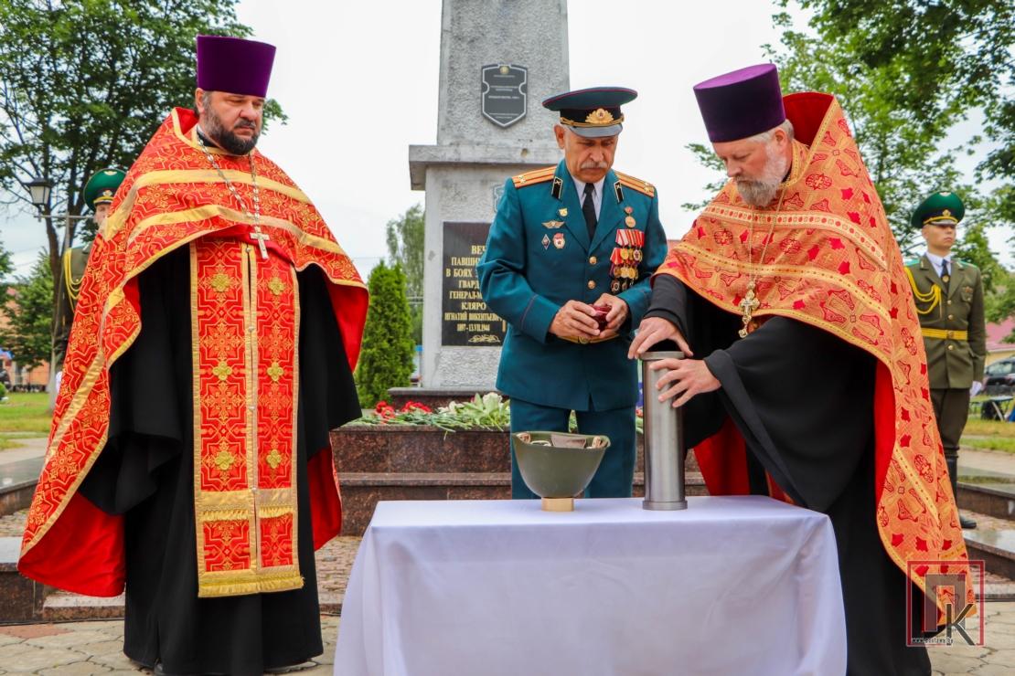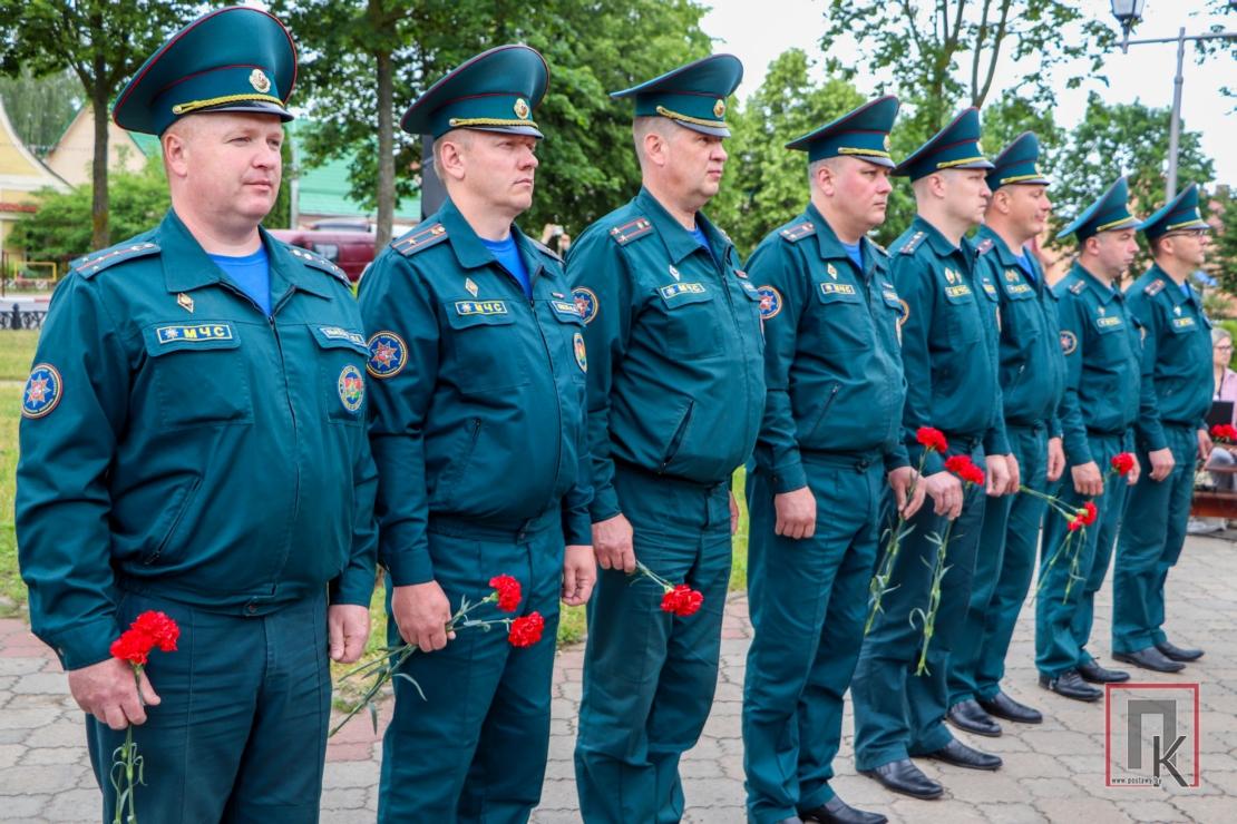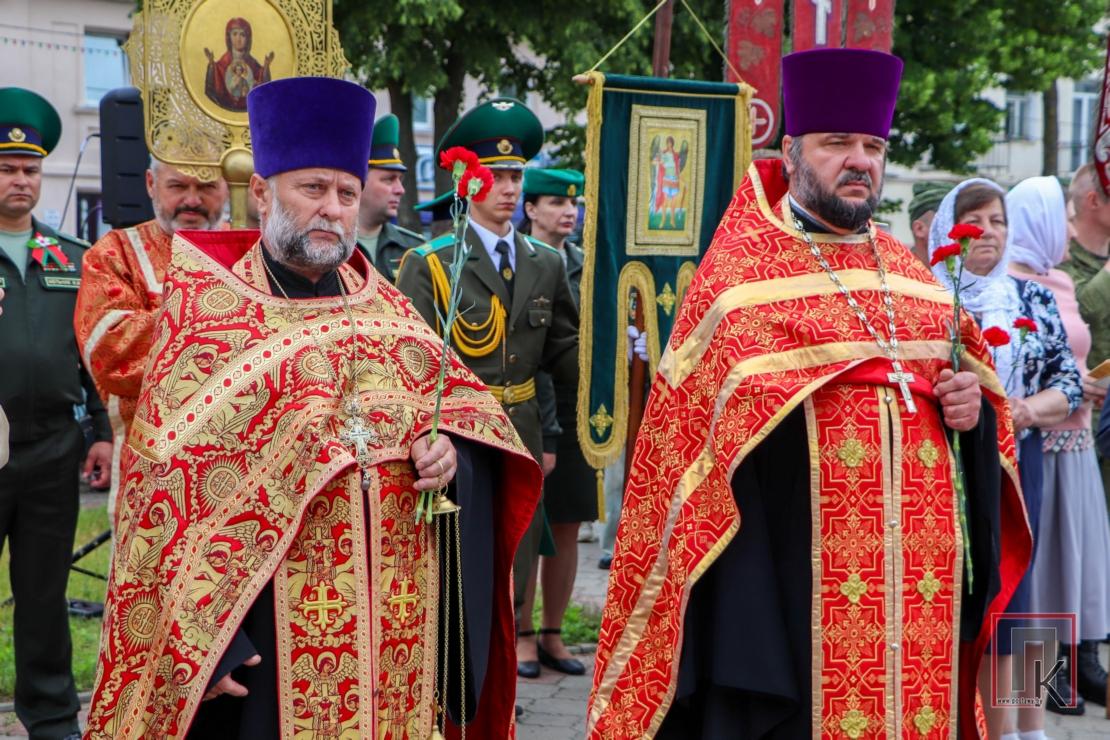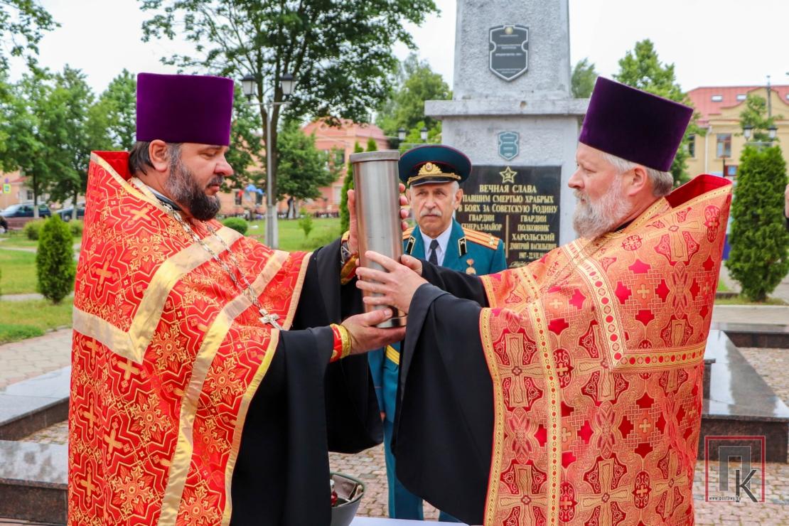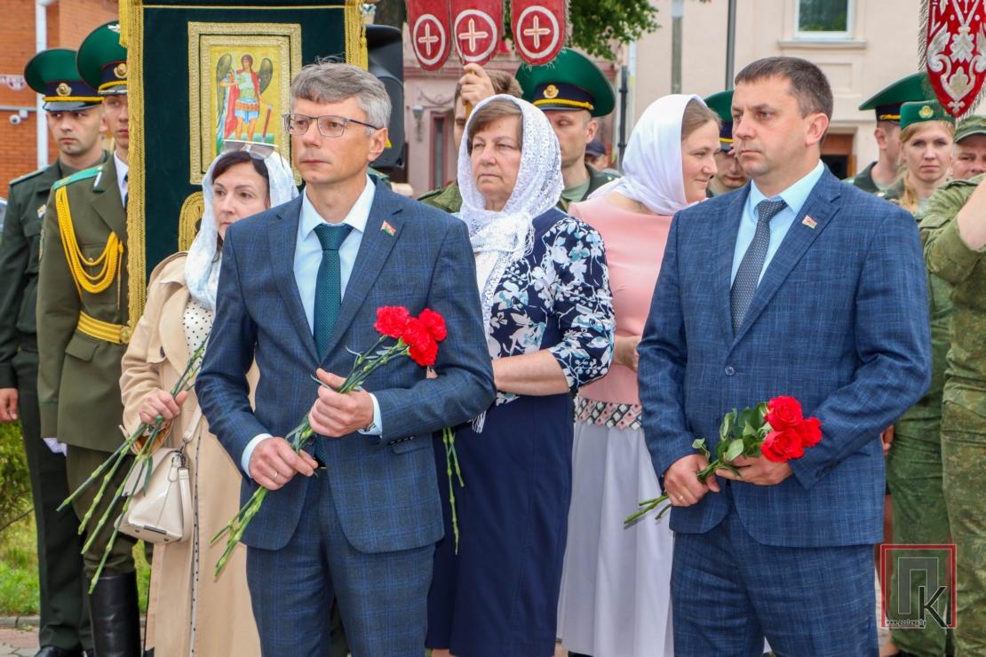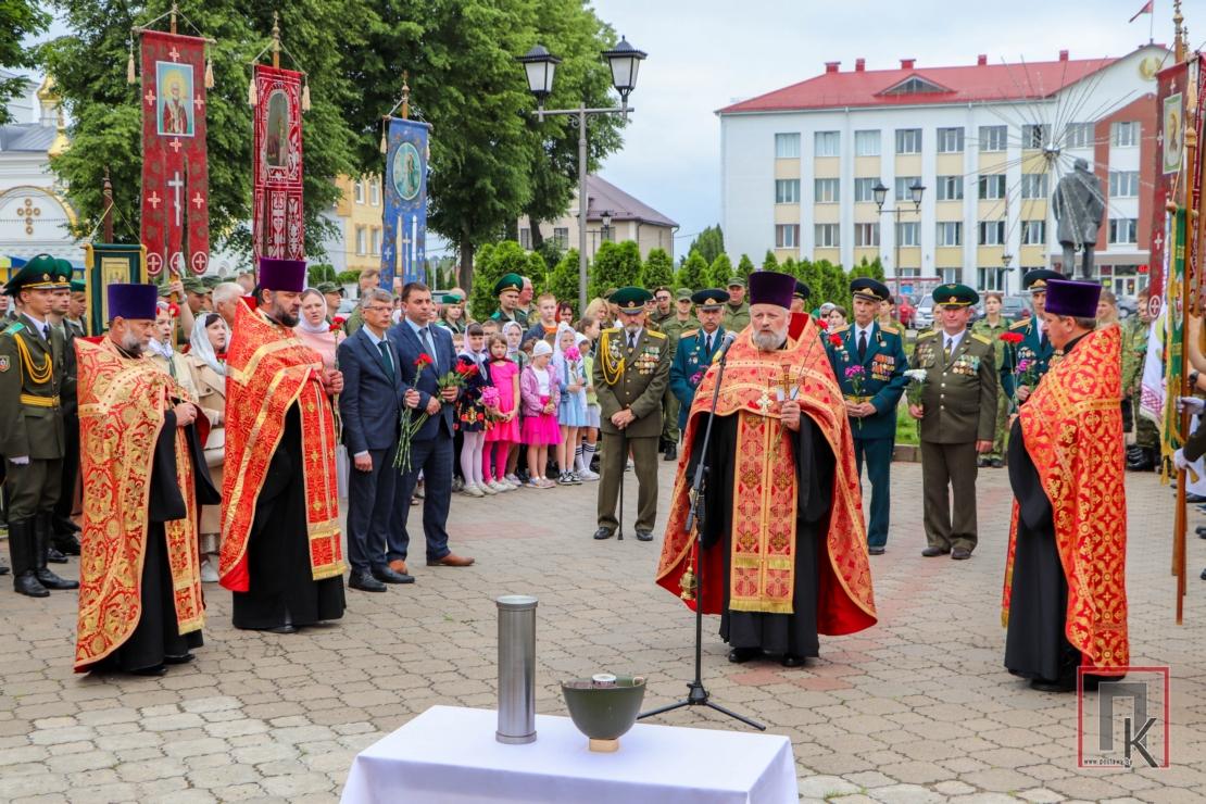Из храма участники мероприятия проследовали крестным ходом к братской могиле на площади Ленина в райцентре. Здесь состоялись лития в память о погибших, митинг и возложение корзин и цветов, передача капсулы с землёй, взятой с мест захоронения героев Великой Отечественной войны на Поставщине. Как набат звучали слова заместителя председателя райисполкома Станислава Чимбурга и помощника начальника госпиталя—начальника отдела идеологической работы и кадрового обеспечения Ильи Аксентьева о необходимости беречь историческую память и чтить подвиги воинов-победителей во имя будущего. Благочинный Поставского округа протоиерей Валерий Пашкевич зачитал обращение Митрополита Минского и Заславского Вениамина, Патриаршего Экзарха всея Беларуси к участникам крестного хода: