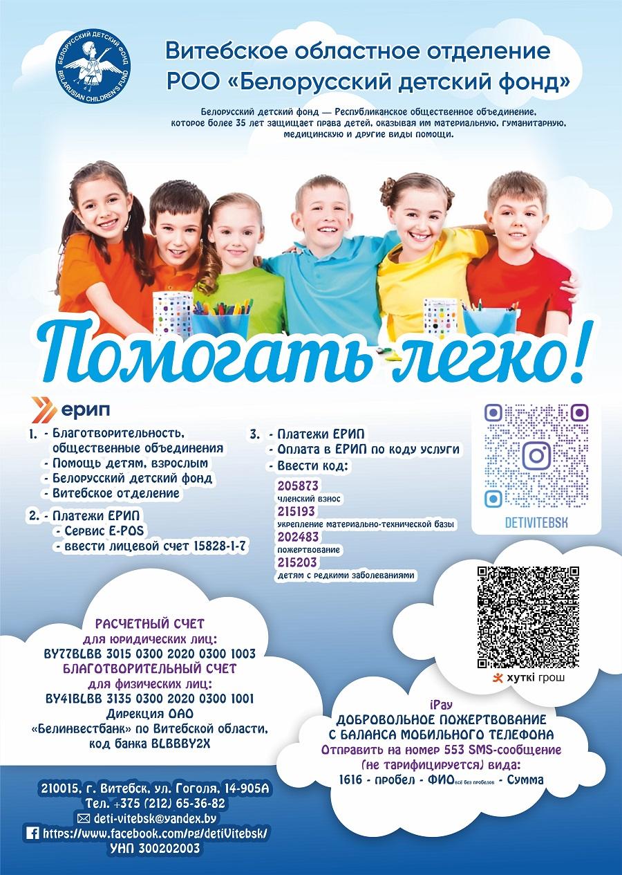- Благотворительность, общественные объединения — Помощь детям,взрослым-Белорусский детский фонд-Витебское отделение-Пожертвование (в поле «ФИО отправителя» написать «Школа» и ФИО отправителя или краткое название учреждения/организации);