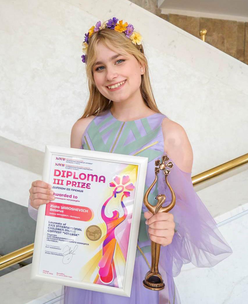136 баллов из 140 возможных набрала Злата Ярошевич на детском конкурсе исполнителей эстрадной песни в рамках Международного фестиваля искусств «Славянский базар в Витебске-2024». Её выступление оценено дипломом III степени. Наша землячка и Кирилл Усов как лучшие исполнители от Беларуси и России награждены специальными призами Парламентского собрания Союза Беларуси и России.