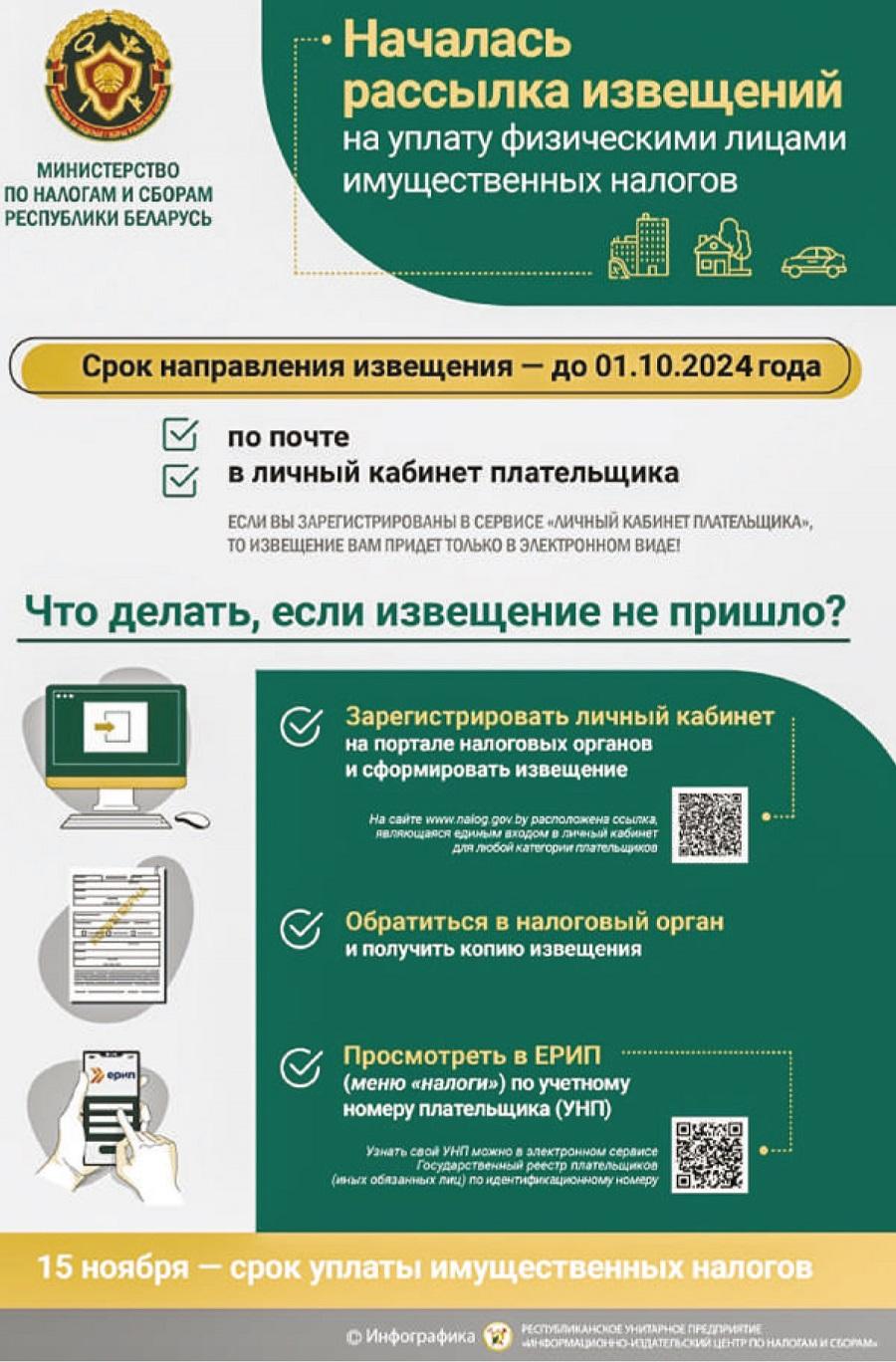 Оно содержит информацию обо всех объектах налогообложения имущественными налогами, принадлежащих плательщику и находящихся на территории Республики Беларусь. То есть, в одном извещении плательщик увидит расчёт каждого из налогов и общую сумму платежа, подлежащего уплате за 2023 год.