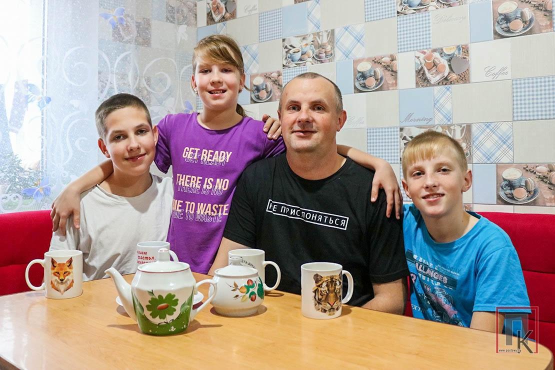 На пороге квартиры в новом доме в микрорайоне 6-го городка меня с любопытством встретили два мальчика и девочка. Вместе с гостеприимным папой провели на кухню. Знакомимся. Представляет всех по очереди старший: «Я — Саша. Учусь в 9 классе. Это мой младший брат Максим. Он шестиклассник. И наша сестра Даша, третьеклассница». Разговор зашёл о любимых школьных предметах и увлечениях. Ребята непосредственные, открытые, правда, на некоторые вопросы о своей жизни, радостях и заботах отвечали сдержанно. Периодически с любовью смотрели на отца, а Даша чаще стремилась прижаться к его руке.