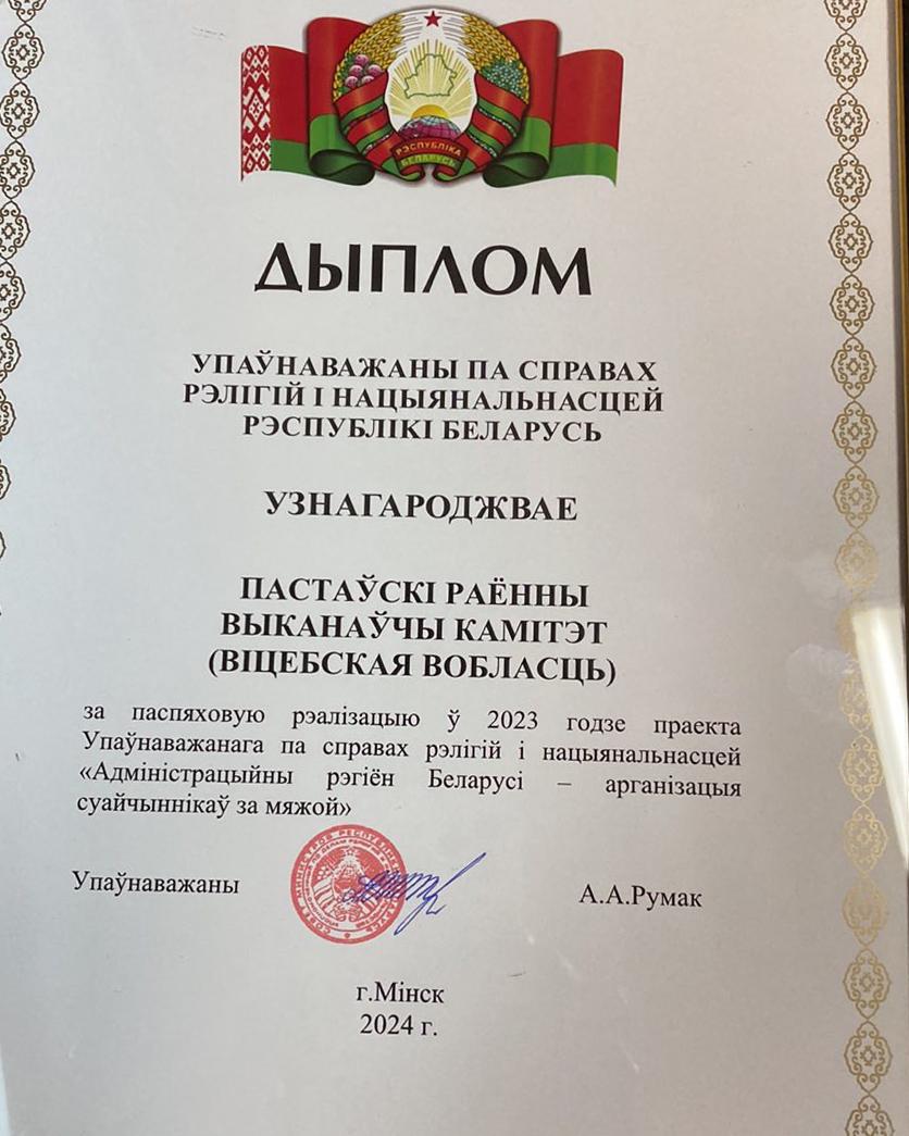 Па выніках рэалізацыі праекта «Адміністрацыйны рэгіён Беларусі — арганізацыя суайчыннікаў за мяжой» у 2023 годзе Пастаўскі раённы выканаўчы камітэт узнагароджаны дыпломам Упаўнаважанага па справах рэлігій і нацыянальнасцей.