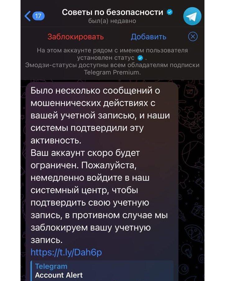 Мошенники пишут людям с аккаунта «Советы по безопасности». Потенциальных жертв предупреждают о якобы блокировке аккаунта из-за «мошеннических действий» с «учетной записью» и просят перейти по ссылке в «системный центр».