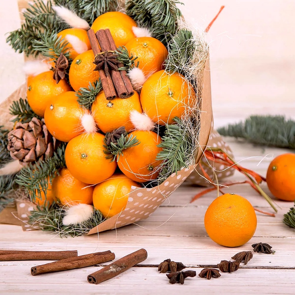 Букет из мандаринов – не только оригинальное украшение для дома, но и отличный новогодний подарок.