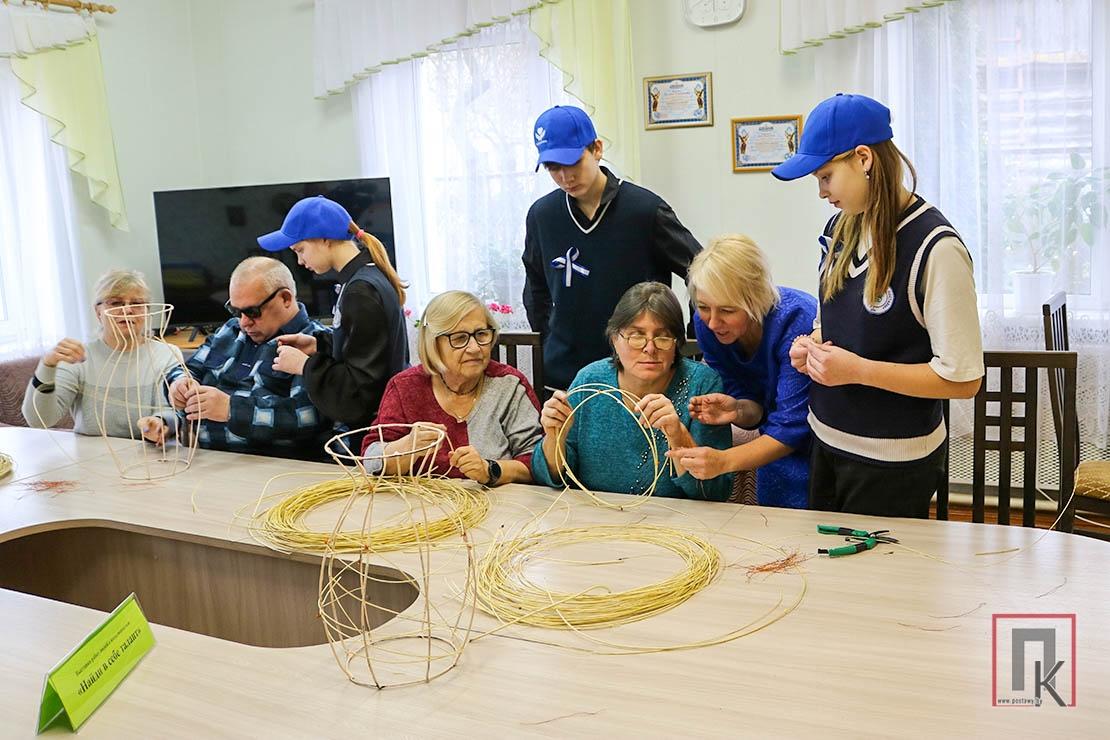 Аддзяленне рэабілітацыі, абілітацыі інвалідаў ТЦСАН — своеасаблівы астравок цеплыні і дабра для людзей, якія страцілі паўнавартасныя фізічныя здольнасці. Тут кожны такі чалавек адчувае ўвагу да сябе і знаходзіць занятак па душы. Пацвердзілі гэта і заняткі з невідушчымі па аплятанні ваз. На дапамогу Аксане Дробышавай прыйшлі валанцёры сярэбранага ўзросту Ніна Торапава і Наталля Кухальская з ліку вучняў СШ №3.