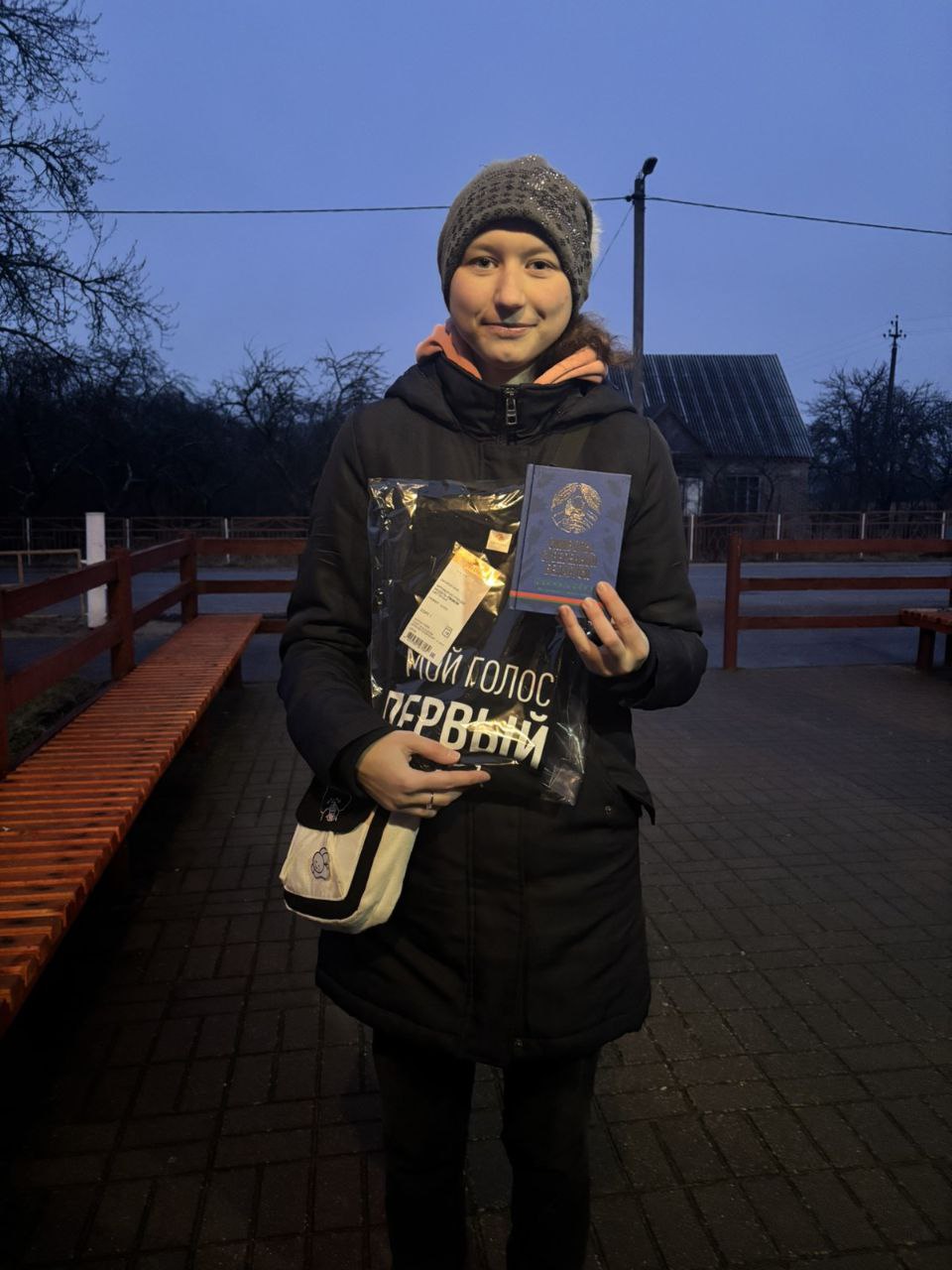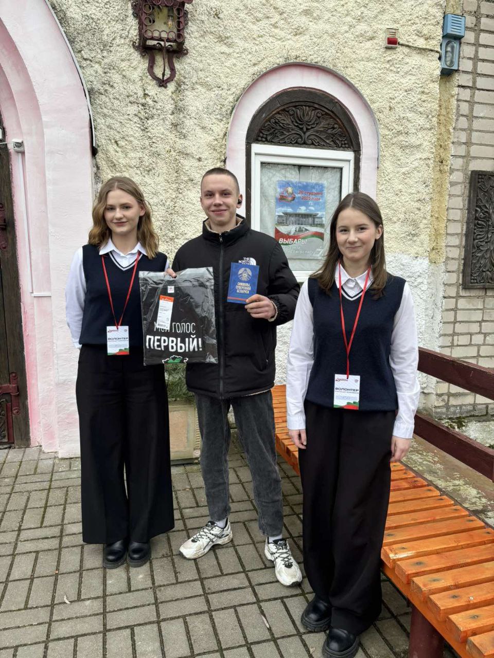 Среди впервые голосующих на участке для голосования в аг. Новосёлки — Наталья Татун и Лознюха Даниил. В подарок девушка получила майку с надписью «мой голос первый» и книгу «Символы суверенной Беларуси».