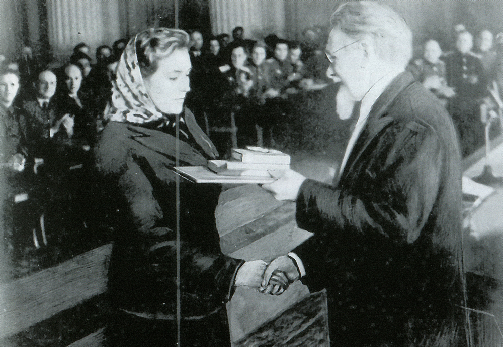 — Затем я вернулась к себе домой в конце 1933 года, поступила учиться на портниху. С приходом Красной армии в 1939 году я поехала работать в редакцию районной газеты и работала там в качестве наборщицы до 1940 года, в 1940 году, в мае месяце, примерно 14 мая, я вступила в комсомол. Райком комсомола послал меня на курсы пионервожатых, я окончила эти курсы и в начале 1941 года поступила работать старшей пионервожатой лынтупской школы. Работала там до начала войны, — рассказывала позже о начале своего жизненного пути Анна Ивановна.