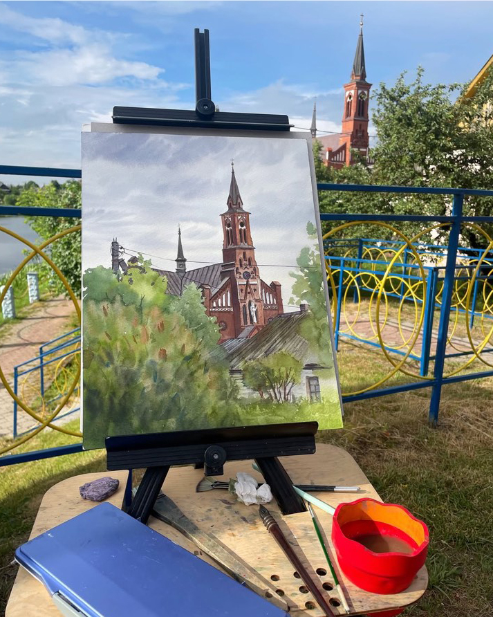 На следующий день художники отправились на Лынтупщину, которая также запомнилась девушке не только своими достопримечательностями, но и тёплым приёмом. «Костёл был прекрасен, но мне захотелось нарисовать более камерный сюжет. В процессе работы ко мне часто подходили местные жители, интересовались, откуда мы приехали. Люди в Беларуси влюбили в себя нас всех!», — рассказывает художница.