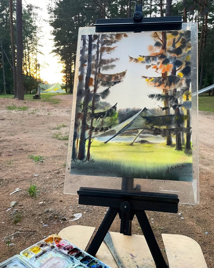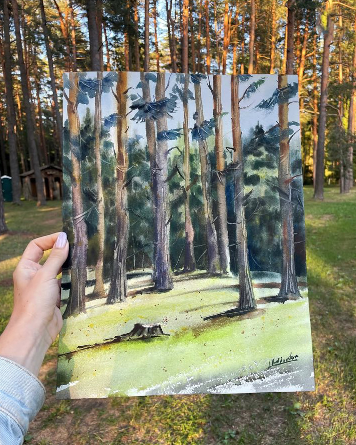 В восхищении осталась российская художница и от места своего проживания — СТК «Озерки»: «Неделю мы жили в удивительно живописном месте среди озёр и сосен. Запах, свет, высокие стволы сосен — всё это очень хотелось сохранить в памяти!» Алёна уверяет: художник может любой момент продлить во времени и забрать его с собой благодаря пленэру. «Когда работаешь с натуры, время начинает жить своей жизнью. Пленэр позволяет вспомнить всё окружающее тебя до мельчайших деталей даже спустя годы! Увожу эту работу домой, чтобы иметь возможность телепортироваться в этот удивительный уголок в любой момент! Если поедете в Беларусь и в Поставы, очень советую заглянуть @stkozerki, это действительно очень уютное и живописное место», — акцентирует девушка.