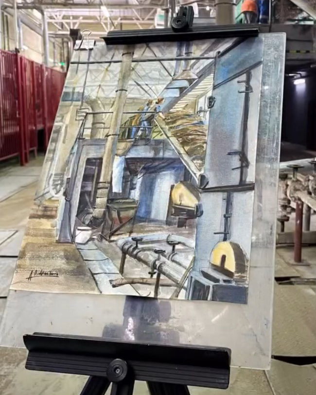Одним из самых запоминающихся моментов для Алёны Овчинниковой стал пленэр на льнозаводе. «Завод — это место, куда не пускают обычных граждан, но благодаря поддержке Поставского райисполкома нас не только пустили, но и разрешили рисовать прямо в рабочих цехах!» — с восторгом пишет она о своём опыте. Несмотря на пыль и шум, художница осталась работать у сушилки льна. «Как оказалось, это одно из самых пыльных мест, ведь именно тут стебли льна выходят из печи и идут на последующую переработку. С непривычки у меня за 10 минут все глаза были засыпаны пылью, дышать с каждым часом тоже становилось всё сложнее. От осознания того, что работники завода так проводят годы своей жизни и уже почти не замечают дискомфорта, глаза наполнялись слезами… Но без их труда наш мир был бы невозможен! Этой картиной я хочу воспеть силу духа людей, работающих в тяжёлых условиях. По всему миру таких людей миллионы, и, к сожалению, мы очень редко задумываемся, на какие жертвы они идут ради того, чтобы у нас была одежда, тепло в доме и еда в холодильнике… Я бесконечно счастлива, что на протяжении трёх часов смогла наблюдать и рисовать людей труда!»