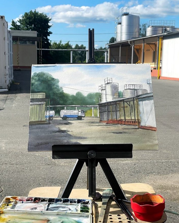 Не обошлось и без ностальгии. Вот что пишет Алёна после пленэра на Поставском молочном заводе: «Натуры было много, но я решила нарисовать молоковозы, сделав отсылку к своим детским воспоминаниям. Молоковозы у меня ассоциируются с дачей. Сразу в памяти всплывает картинка, как я бегу с бидоном за бочкой с молоком…» Трогательно, душевно и по-настоящему, правда?..