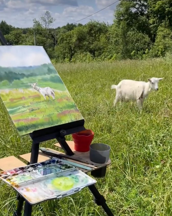 В последний день своего пребывания на Поставщине художники посетили деревню Париж, где могли с натуры рисовать храм. Но, выйдя из машины, Алёна увидела козочку, которая недалеко паслась на поле. Видимо, та запала ей в душу, поскольку художница, не раздумывая, взяла свои вещи и направилась прямо к ней. Порядка двух часов они провели вместе, и, как отмечает автор, «за это время успели подружиться». «Ни одна студийная работа не содержит в себе столько эмоций и воспоминаний! Рисование с натуры — это настоящее счастье, и я рада, что теперь у меня дома живёт картина, наполненная такими милыми и живыми воспоминаниями!», — пишет Алёна.