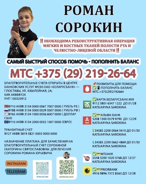 Любая сумма, перечисленная на счёт Ромы, приблизит его к долгожданной операции. Не оставайтесь в стороне! Только вместе получится подарить шанс маленькому поставчанину снова вдохнуть жизнь полной грудью.