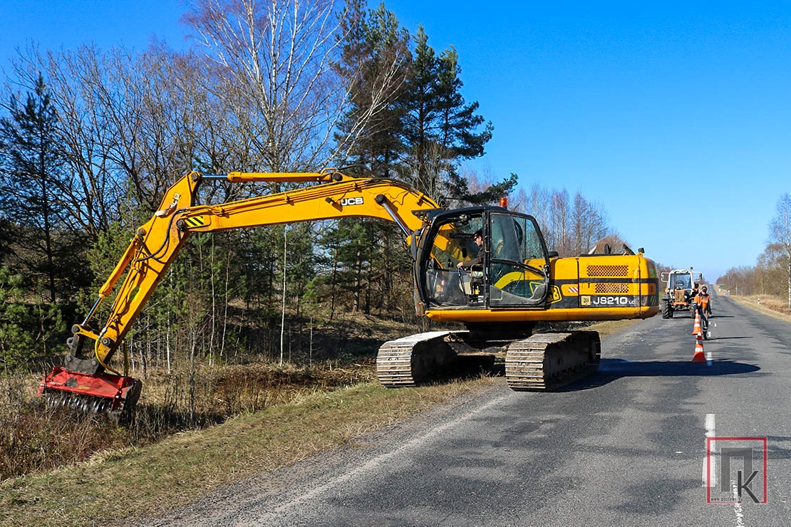Недавно ехала в Лынтупы. На одном из участков дороги — от деревни Свирдуни до горпосёлка — на обочине установлены предупреждающие дорожные знаки о снижении скорости и дорожных работах. Дальше увидела компактный экскаватор с непривычным приспособлением, которое за секунды «съедало» от вершины до корня деревья с тонкими стволами, а также кустарники. Из-под зубьев вылетала мелкая щепа, которую машина частично закапывала в землю.