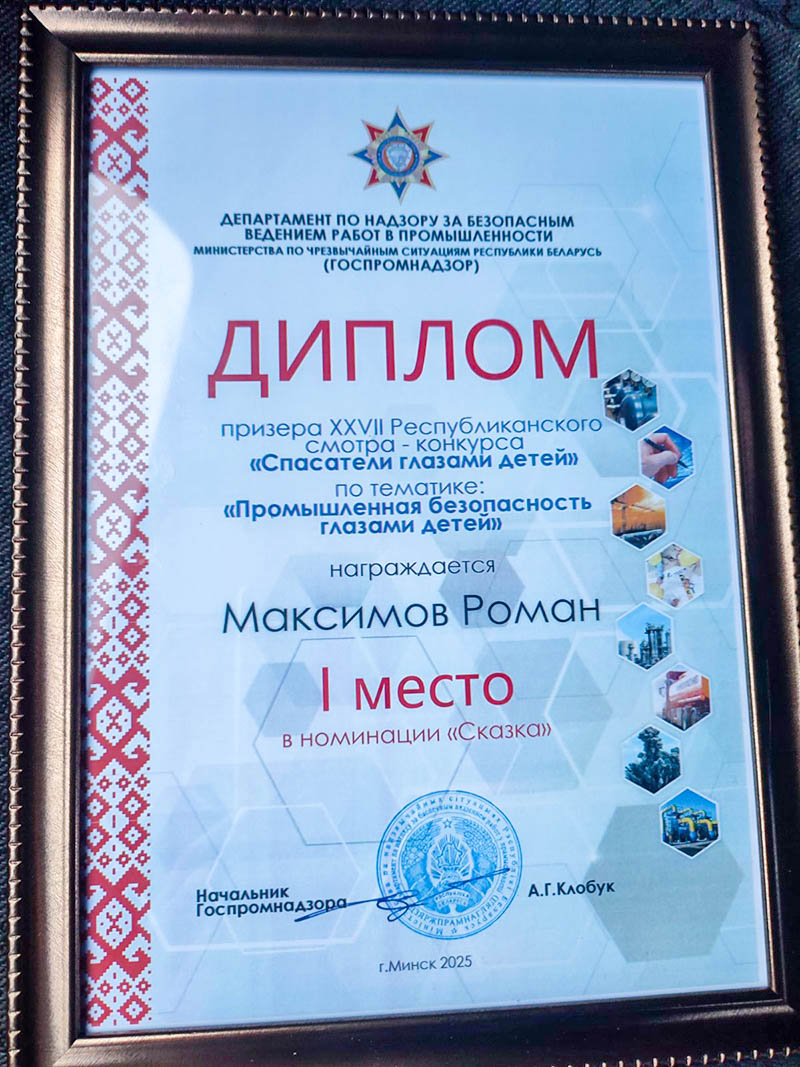 Домой Рома привёз диплом победителя, который ему лично вручил начальник Госпромнадзора Александр Клобук, книгу-каталог с иллюстрациями работ финалистов и стильные беспроводные наушники фирмы Sony. Юноша признаётся, что этот день запомнится ему надолго.
