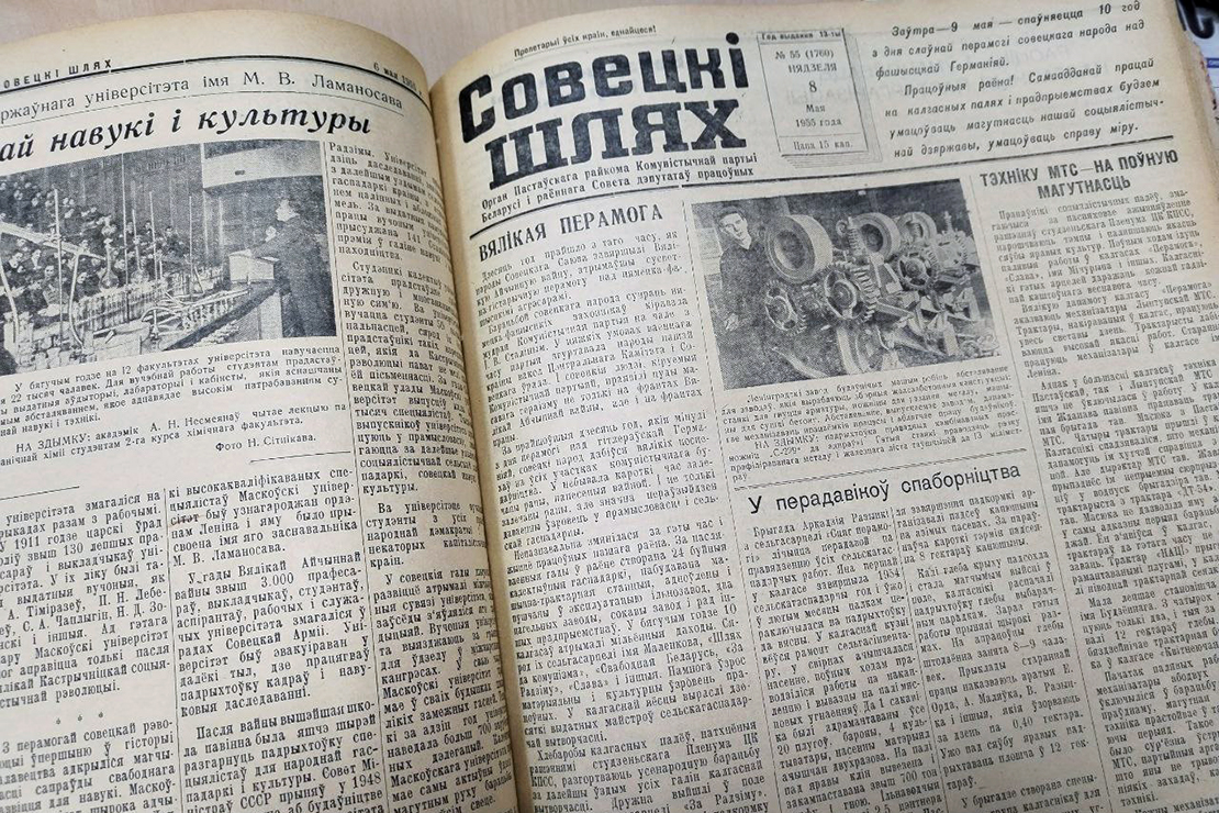 — За 10 гадоў, якія мінулі з дня перамогі над гітлераўскай Германіяй, савецкі народ дабіўся вялікіх поспехаў на ўсіх участках камуністычнага будаўніцтва, — чытаю ў нумары пастаўскай раёнкі за 9 мая 1955 года. — У небывала кароткі час залечаны раны, нанесеныя вайной. І не толькі залечаны раны, але і значна пераўзыдзены даваенны ўзровень у прамысловасці і сельскай гаспадарцы.