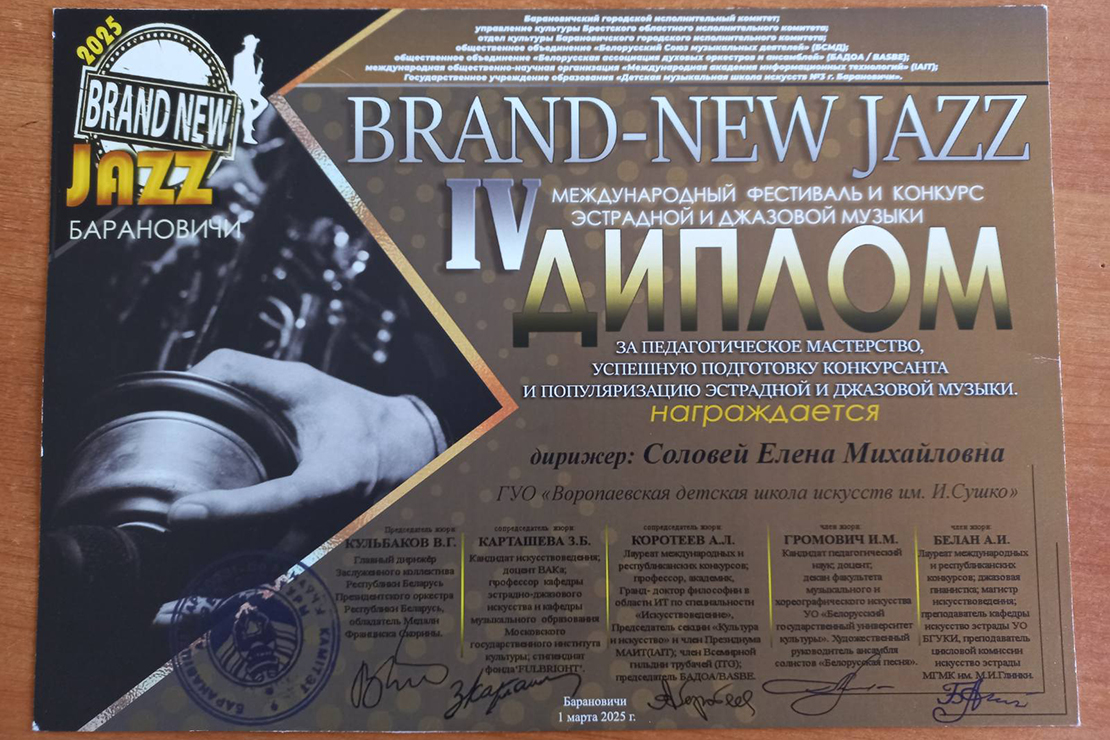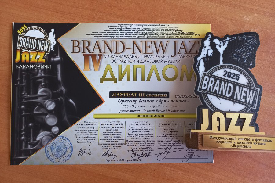 Оркестр баянистов «Арт-тоника» под руководством Елены Соловей Новосёлковского филиала Воропаевской детской школы искусств имени Иосифа Сушко на V Международном фестивале-конкурсе эстрадной и джазовой музыки Brand-new Jazz-2025 стал лауреатом III степени.