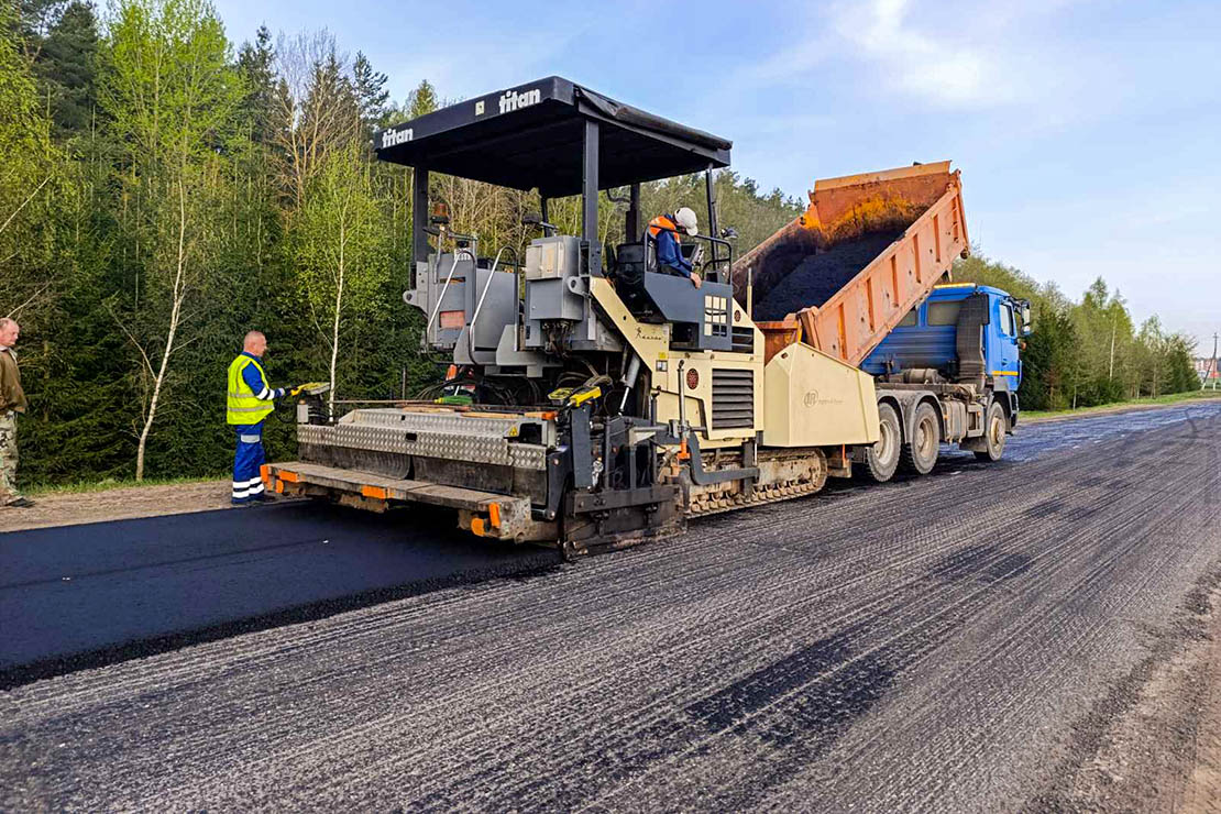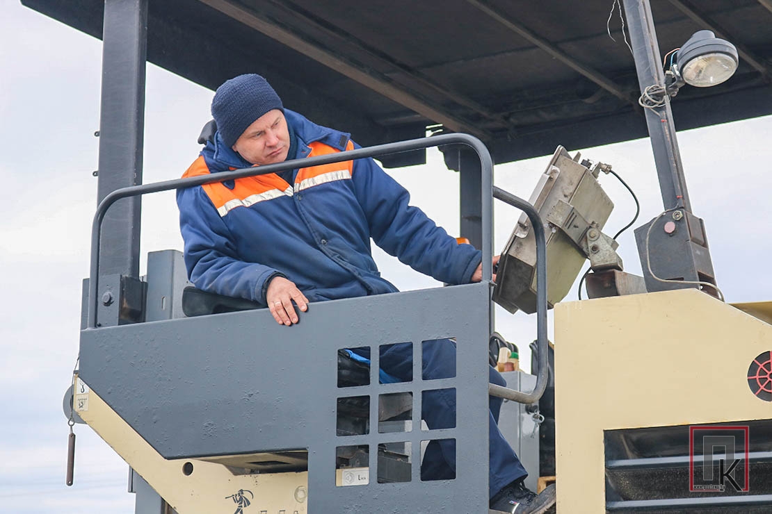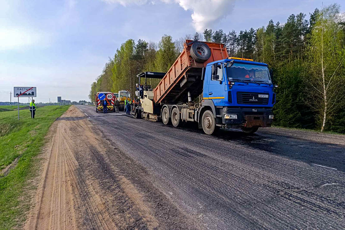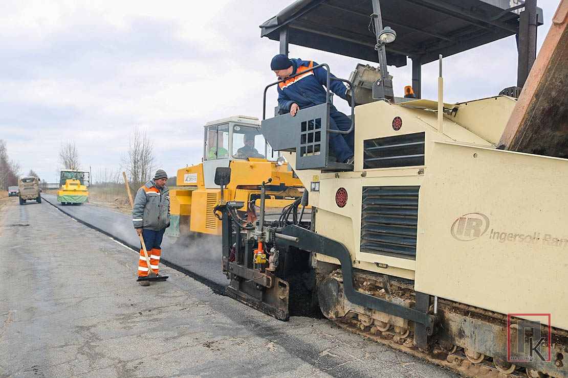 В проведении работ помощь коллегам из ДЭУ-33 оказывает бригада мастера Дмитрия Сметанко из филиала «Поставское ДРСУ-132». Задействованы асфальтоукладчик, два катка, дорожные рабочие. Асфальт доставляют с асфальтобетонного завода ДРСУ-132 в Ботвинах. Производственный процесс контролируют начальники линейно-дорожной дистанции Григорий Лапутко и Алексей Шаломицкий. Понаблюдала за работой дорожников.