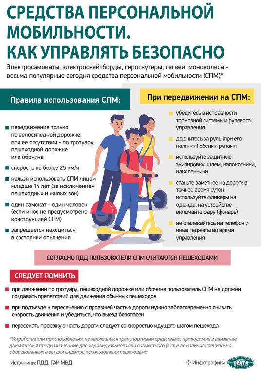 СПМ представляют потенциальную опасность, поскольку не оборудованы эффективными системами безопасности. Поэтому у них всегда должны быть исправными тормозная система и рулевое управление. При движении в тёмное время суток или при недостаточной видимости дороги пешеход должен обозначить себя световозвращающим элементом, а на СПМ — включить фару или фонарь. Передвигаться на СПМ следует в первую очередь по велодорожкам, а при их отсутствии — по пешеходным дорожкам, тротуарам или обочинам, не создавая препятствий для других пешеходов. Необходимо строго соблюдать ограничение скорости движения — не более 25 км/ч.