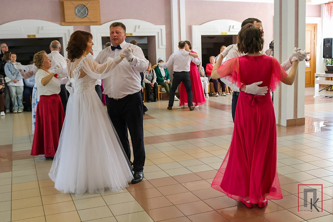 — Нас запрасілі Юрый і Валянціна Бакуновічы, з якімі актыўна праводзім вольны час у Плешчаніцах, дзе рэалізуюцца два танцавальныя праекты: «Танцуюць усе!» і «Танцы. Рух. Жыццё», — расказвалі Віктар і Вера Рыжыкі. — У шлюбе мы 40 гадоў, выхавалі дваіх дзяцей, маем пяць унукаў. Лічым, што між штодзённых клопатаў трэба знаходзіць час для сябе, каб пабыць сам-насам. Танец абуджае рамантычныя далiкатныя пачуццi адно да аднаго, змякчае нават зачарсцвелыя сэрцы. Да балю рыхтаваліся дыстанцыйна, з дапамогай відэа. Крыху хваляваліся. А акунуліся ў атмасферу добразычлівасці і музыкі — і ногі самі сталі выконваць патрэбныя рухі.