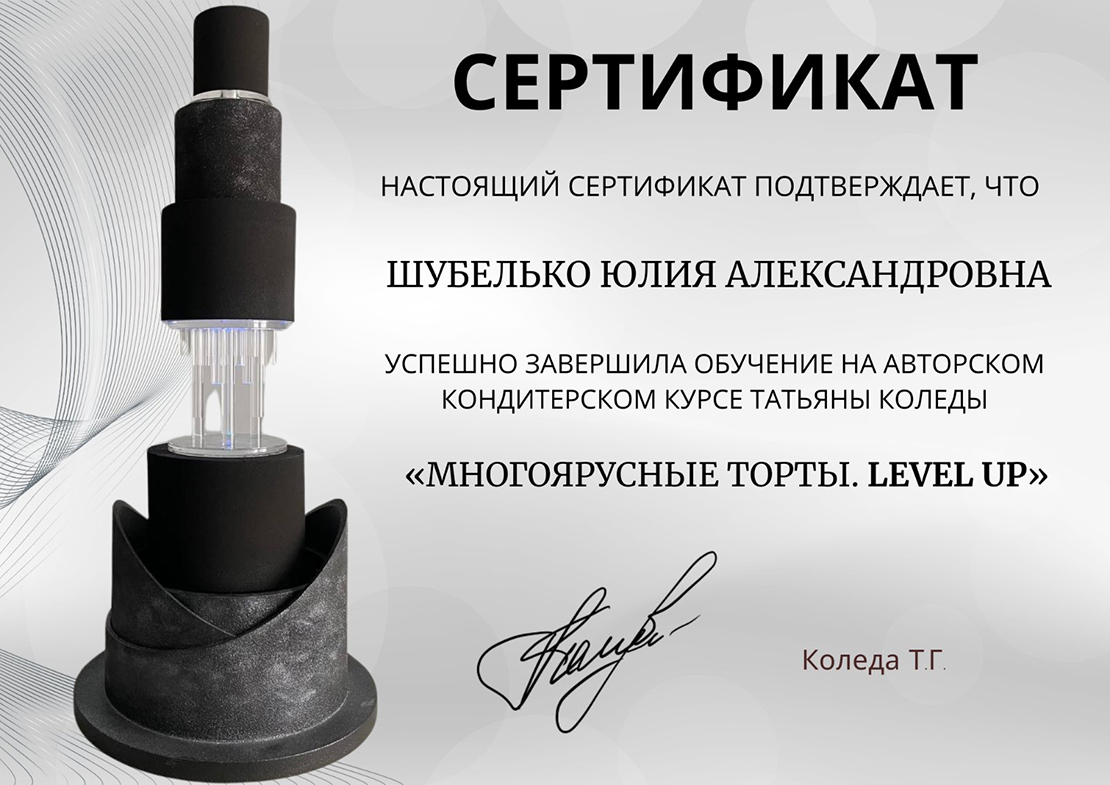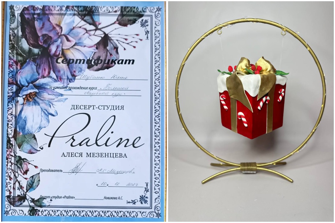 Спустя год Юля Шубелько окончила 3-дневные курсы кондитера в Минске, а затем ещё 2 месяца осваивала кондитерское искусство онлайн. Новые знания она применила на экзамене, который отрабатывала также дома — сделала впечатляющий торт весом 7,5 кг и высотой 64 см.(Кстати, увидеть его можно на той же страничке в Instagram.) Процесс создания зафиксировала на видео, а саму красоту бережно упаковала и повезла в Микашевичи: там отмечали первый юбилей младшей дочери. Стоит отметить, что торт прошёл проверку расстоянием почти в 400 километров, подтвердив высочайшее качество работы мастера.