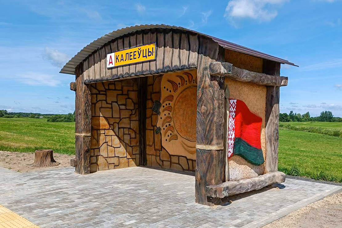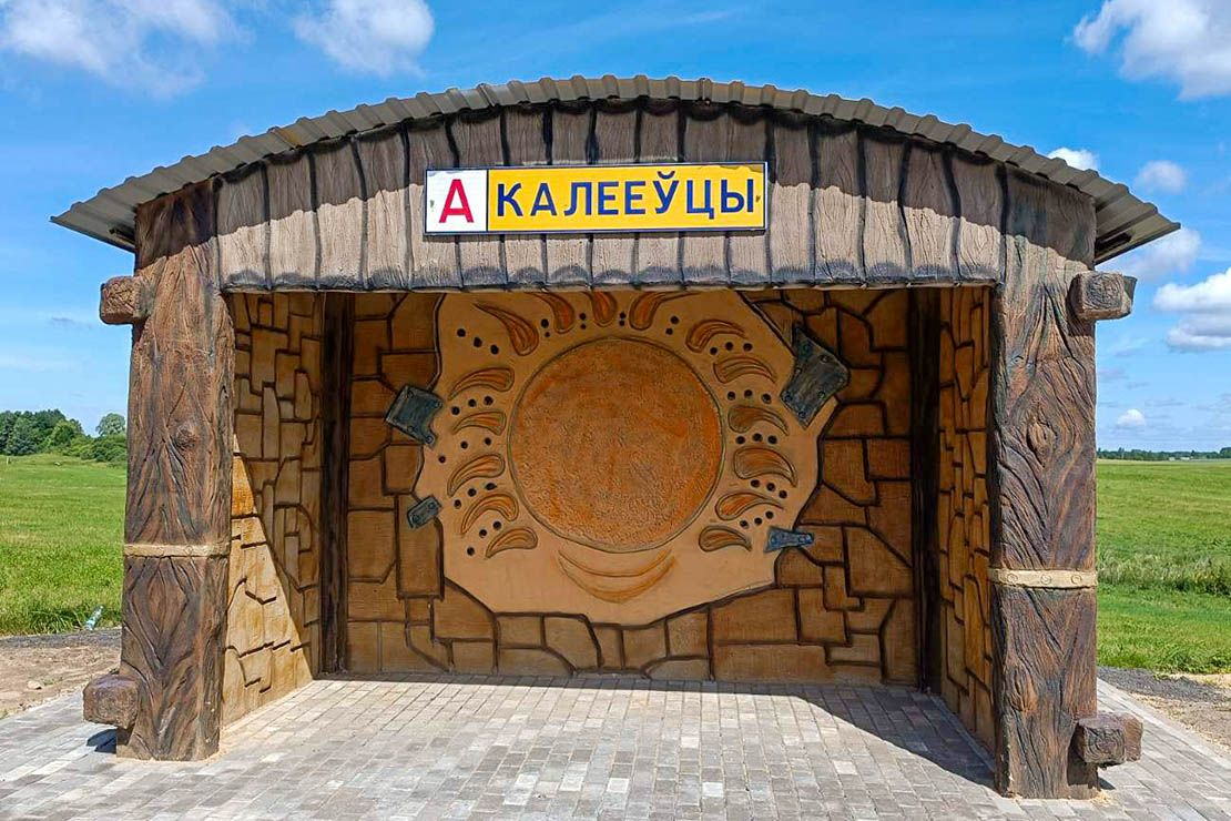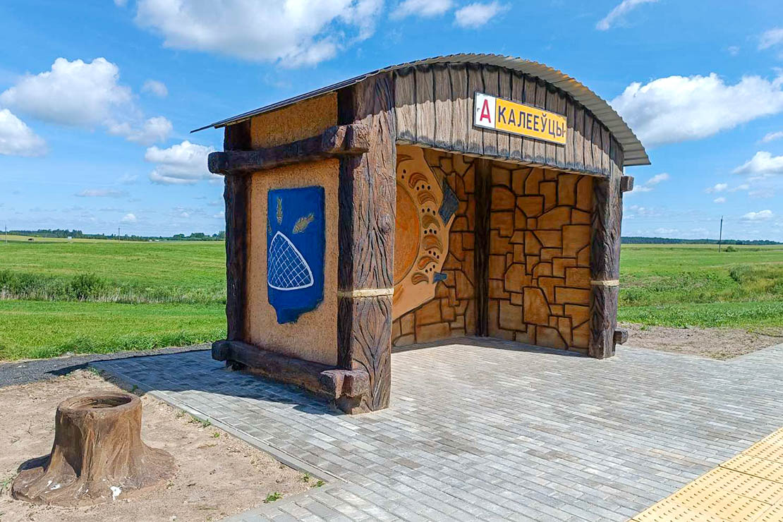 Паварочваючы з 11-кіламетроўкі ў бок Мядзельскага раёна, немагчыма не звярнуць увагу на патрыятычна аформлены аўтобусны павільён, які з’явіўся на прыпынку ў вёсцы Калееўцы. На правым баку павільёна намаляваны флаг Беларусі, на левым — герб Пастаў, у сярэдзіне — яснае сонейка.
