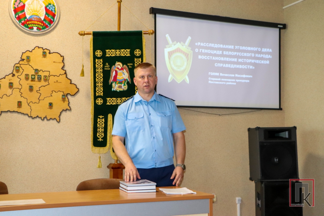 Старший помощник прокурора Поставского района Вячеслав Голяк выступил перед коллективом 1-го военного госпиталя ОПС Республики Беларусь по теме: «Геноцид народа Беларуси в годы Великой Отечественной войны. Трагедия Поставщины». Великая Отечественная война стала самым трагическим событием в истории Беларуси. Она унесла жизни каждого третьего белоруса. Политику осознанного геноцида на нашей земле нацисты начали осуществлять уже с первых дней войны.