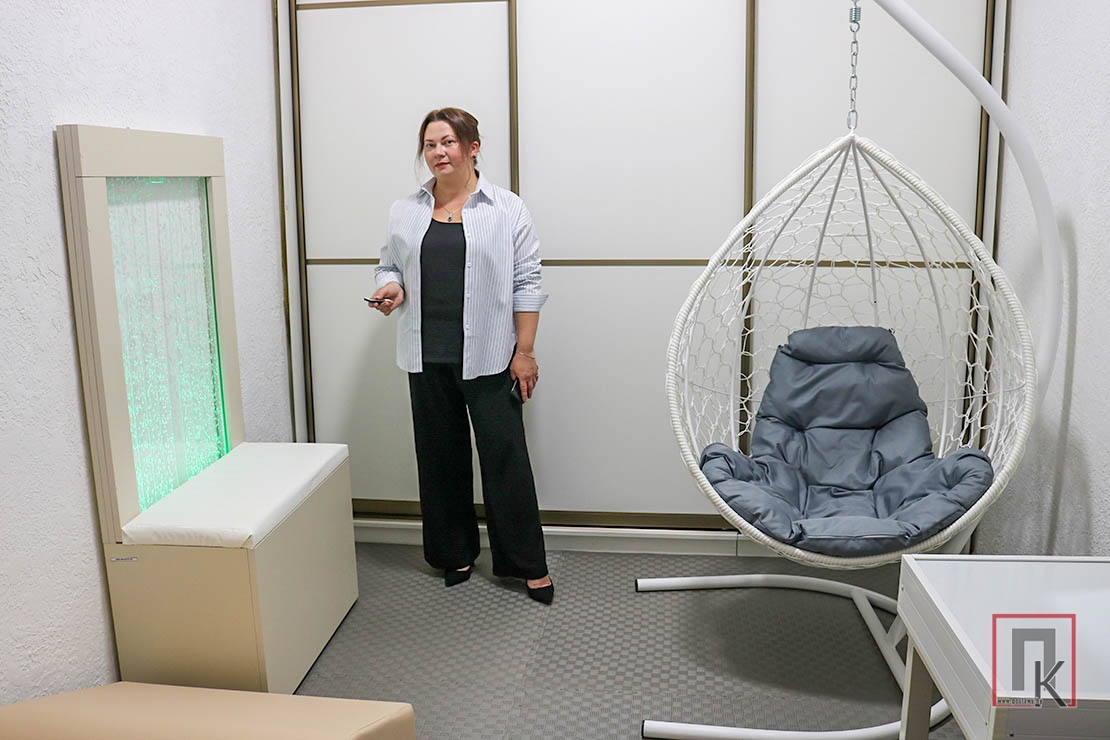 — Раней тут было кнігасховішча, — расказвала Іна Іванаўна, паказваючы новы кабінет. — Яно не знікла. Падручнікі і вучэбныя дапаможнікі — а іх больш за 3 тысячы экзэмпляраў, і імі мы забяспечваем усе школы раёна, у якіх асаблівыя дзеці займаюцца па спецыяльных праграмах — размясцілі ў гэтай вялізнай, на ўсю сцяну, шафе-купэ. Яе нам бясплатна вырабіла ААТ «Паставымэбля». Пасля з’яўлення шафы вызвалілася значная плошча, і мы перанеслі сюды з іншага кабінета фібераптычны дождж, стол для малявання пяском і камяні Савы. Не без фінансавага ўдзеду іншых пастаянных спонсараў: лясгаса, Пастаўскага мэблевага цэнтра і завода «Проміс» — адрамантавалі памяшканне, заслаўшы падлогу буда-матамі, набылі бурбалкавую панэль з некалькімі варыянтамі падсветкі, праектар зорнага неба, анатамічны куб-мат, каб можна было прылегчы і рэлаксаваць. Таксама купілі падвясное крэсла-кокан і інтэрактыўную панэль «Бясконцасць» са святлодыёднымі модулямі, якія ствараюць візуальны эфект тунэля.
