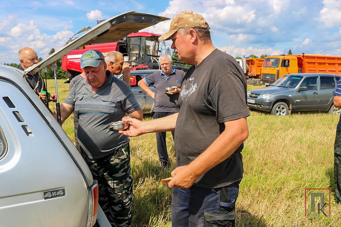 Пакуль гутарыла з удзельнікамі жніва, вадзіцель Уладзімір Дзісько са сталовай у Палессі прывёз абед, які прыгатавалі Нэлі Дубіновіч і Лілія Паршукова. Механізатары хутка перакусілі і заспяшаліся ў кабіны камбайнаў. Пасля азімага ячменю на чарзе — ячмень яравы, пшаніца, іншыя культуры.