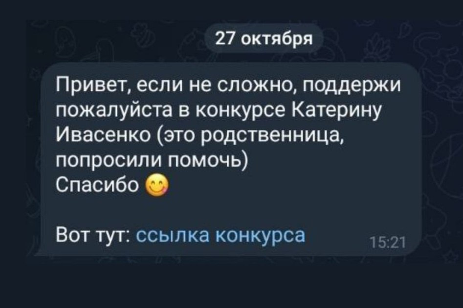 В последнее время пользователям Telegram стала приходить спам-рассылка от знакомых с просьбой поддержать родственника в конкурсе. В сообщениях пользователей просят перейти по ссылке для голосования.