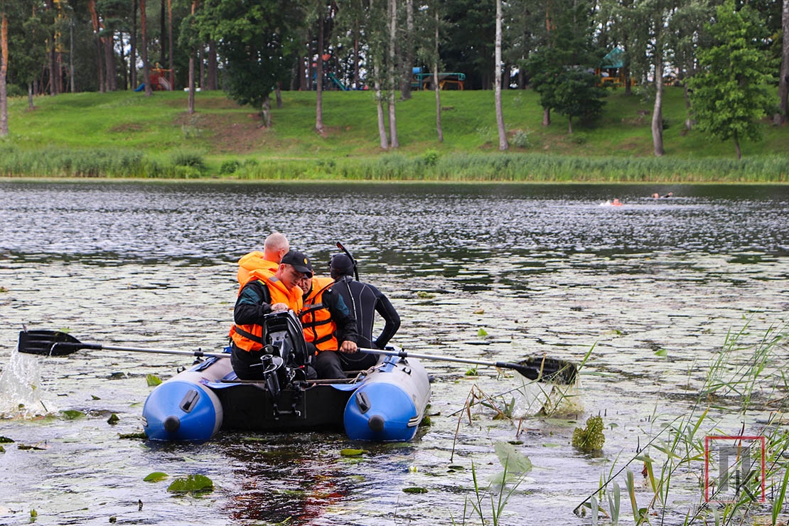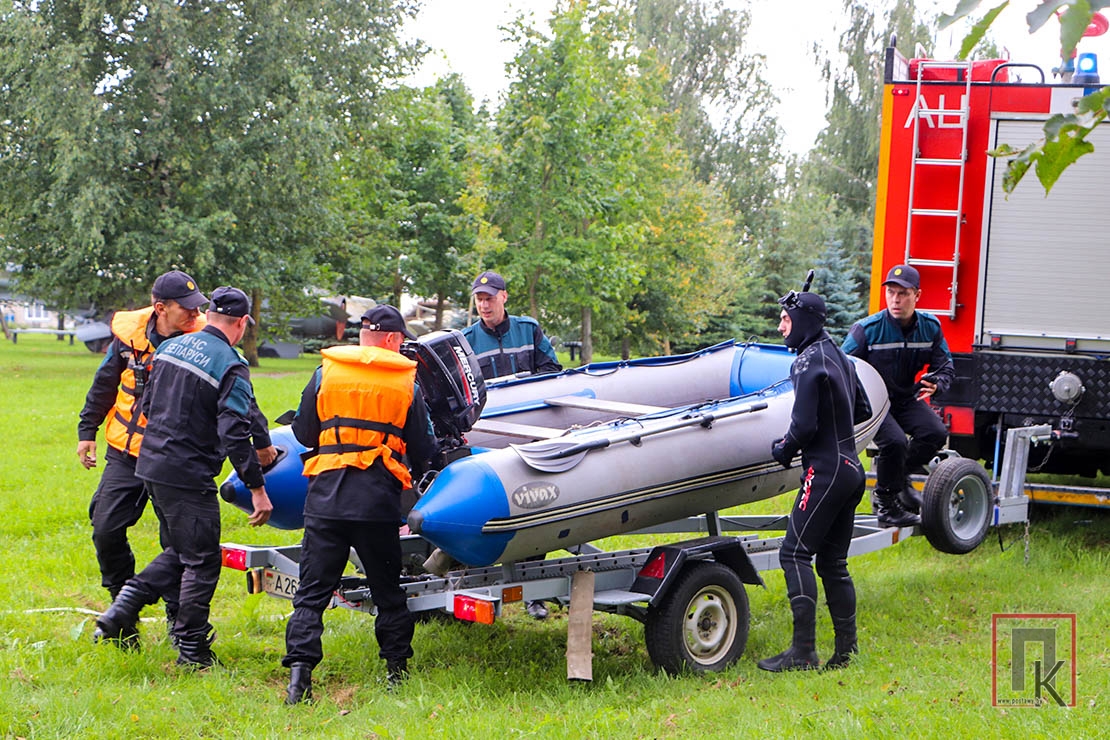 Сегодня в акватории реки Мяделка прошло показательное выступление спасателей Поставского РОЧС. По легенде, двое рыбаков (один — в спасательном жилете, другой — без) перевернулись на лодке и нуждались в помощи.