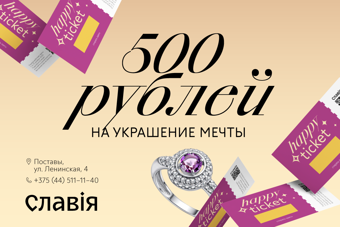 С 21.08 по 30.09 при любой покупке в магазинах Славия вас ждёт счастливый билетик с гарантированным бонусом: от приятной дополнительной скидки до 500 рублей на украшение мечты!