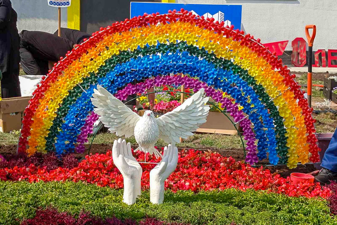 — Рыхтаваліся мы да яго творча і ўдумліва, — дзяліўся майстар па добраўпарадкаванні УП ЖКГ Мікалай Кісялёў. — Разглядалі розныя варыянты кампазіцый і спыніліся на эскізе, які прапанавала наша кветкавод Вольга Цімафеева. Чаму, як не тэме міру, прысвяціць кампазіцыю ў год 80-годдзя Вялікай Перамогі? Выбралі такія яго сімвалы, як вясёлка над квітнеючай зямлёй і галуб, выпушчаны з працоўных рук у мірнае неба.