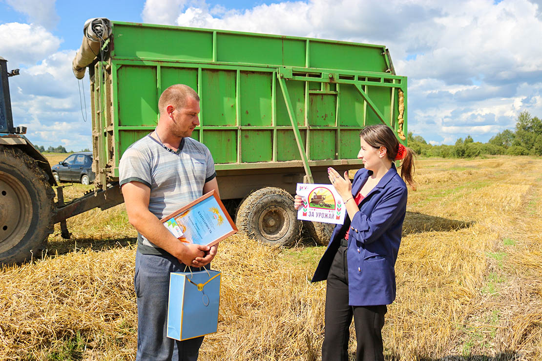 З гэтай нагоды ў поле прыехала другі сакратар райкама БРСМ Анастасія Зайкоўская. Камбайны заканчвалі ўбіраць азімую пшаніцу за вёскай Пашкава. Уладзіміра чакалі на ўскрайку поля. Сюды яго трактар з загружаным прычэпам выцягнуў трактар, прызначаны для буксіроўкі. Хуценька адчапіўшы трос і адпусціўшы механізатара па чарговы рэйс, перадавік спыніўся для віншаванняў. Анастасія падзякавала тысячніку за старанне. А ён прызнаўся, што сваю работу заўсёды выконвае добрасумленна. І падчас жніва проста імкнуўся хутчэй адвозіць збожжа ад камбайнаў на зернесушыльны комплекс і вяртацца назад, каб тэхніка не прастойвала.