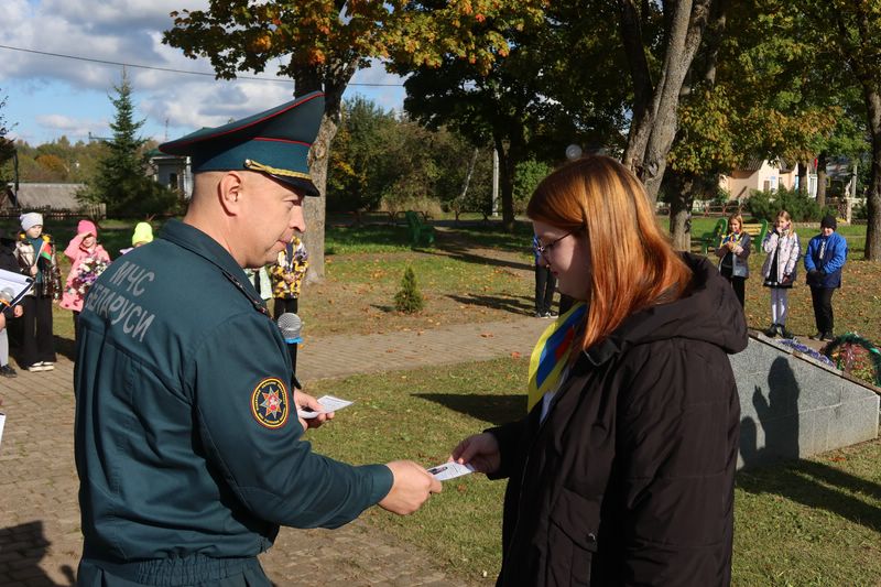 В торжественной обстановке заместитель начальника Поставского РОЧС Дмитрий Лапанович вручил самым активным школьникам удостоверения Белорусской молодёжной общественной организации спасателей-пожарных. Документ стал признанием их стремления к служению обществу и готовности защищать его.