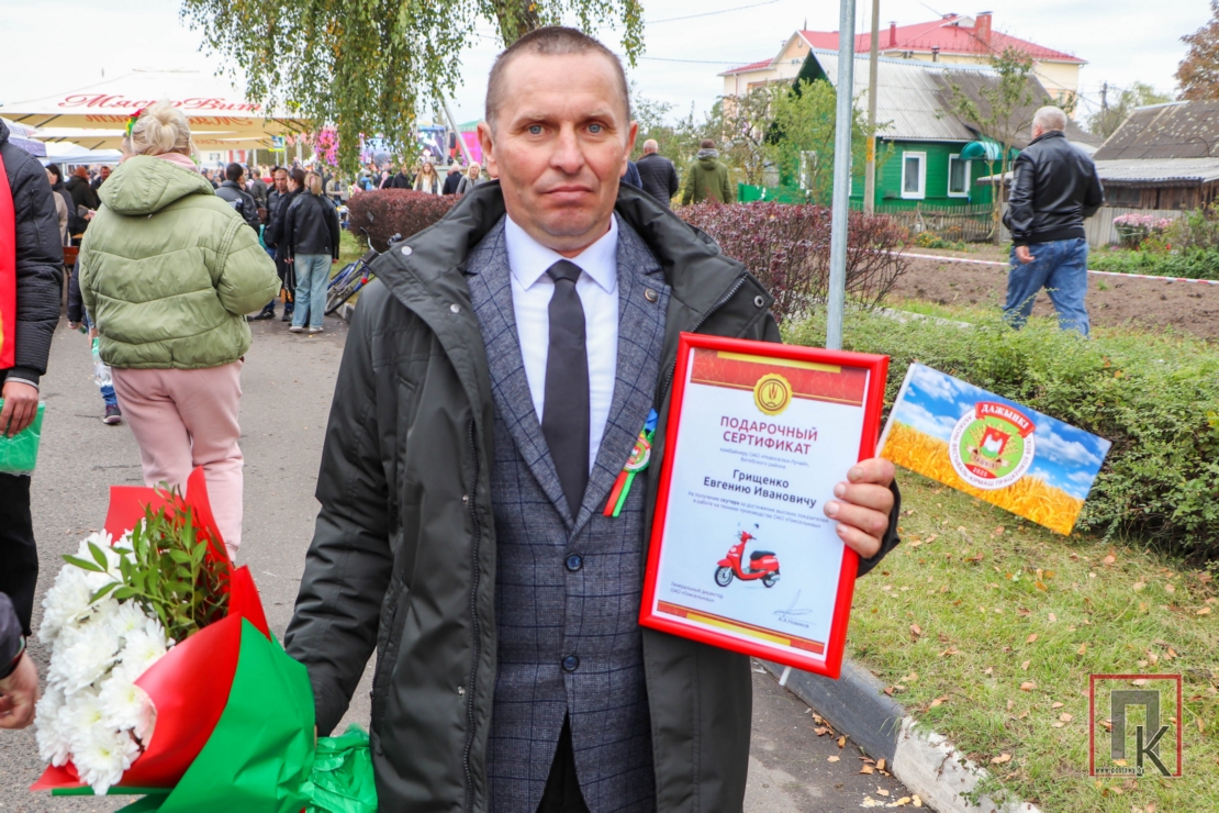 — Вынік жніва — калектыўная праца, — гаварыў ён. — Ураджай вырас добры, а ўбіралі яго ў найскладанейшых умовах. Стараліся ўсе. У гэтай узнагародзе ёсць часцінка кожнага. А найбольшая — дырэктара гаспадаркі Вячаслава Крыштафовіча, які ніколі не лічыцца з часам, усё трымае на кантролі і стварае ўмовы для плённай працы.
