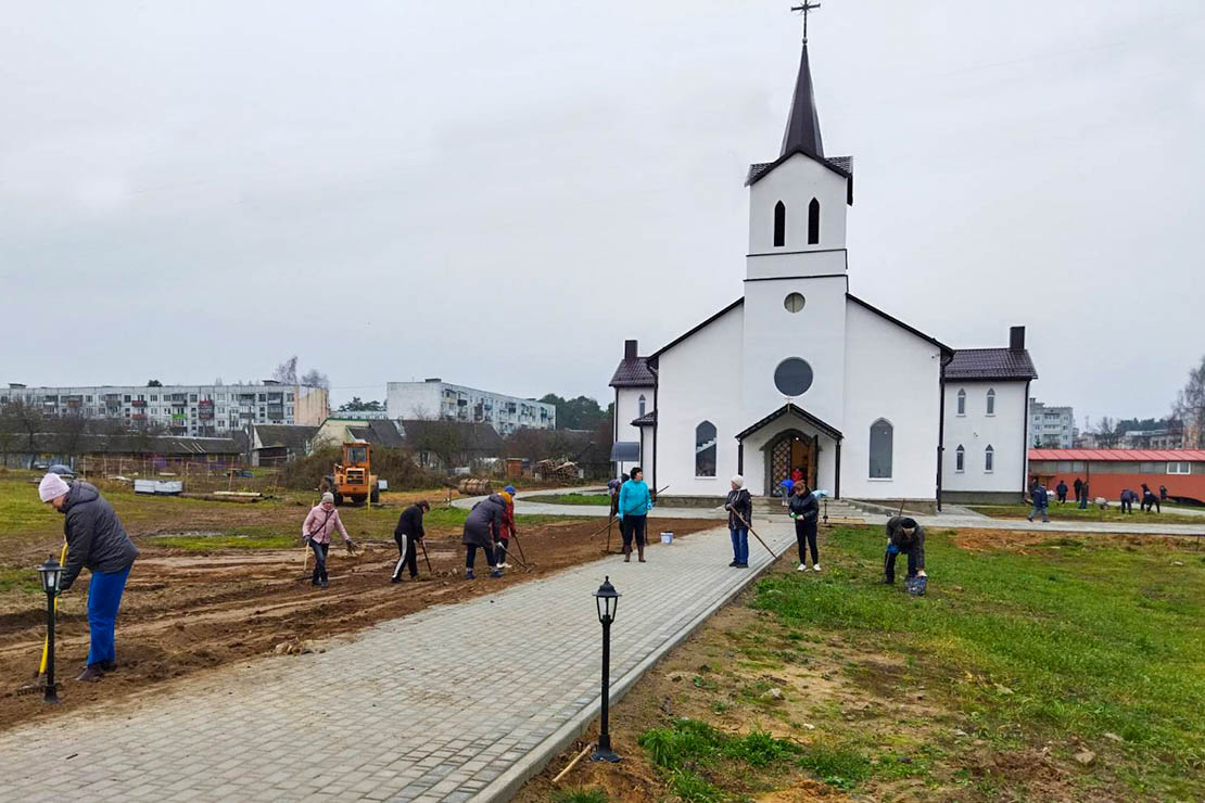Пасля святой Імшы ксёндз Павел расказаў, што трэба зрабіць, размеркаваў абавязкі і адправіўся на асвячэнне могілак у Курсевічах, Грыдзьках, Пагарцах, Андронах. А людзі (сабралася каля сотні чалавек) узяліся за работу. Амкадор развозіў зямлю, жанчыны яе разраўноўвалі. Хтосьці выносіў выкарыстаныя паддоны, збіраў друз, іншыя выграбалі сухую траву, рыхтавалі глебу пад газон. Многія прыйшлі сем’ямі: муж, жонка, дзеці. Ніхто не застаўся без справы, работы хапіла кожнаму. Талакой хутка навялі парадак, і цяпер прыемна глядзець на прыкасцельную тэрыторыю.