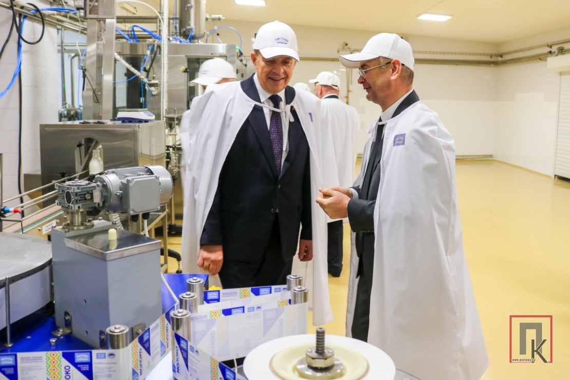 Осмотрев новый корпус больницы, высокие гости оправились на Поставский молочный завод. В Беларуси действуют 32 предприятия по выпуску молочной продукции. Поставский молочный завод — один из крупнейших на Витебщине как по объёмам переработки сырья, так и по количеству и ассортименту выпускаемой продукции. Доминирующее положение в структуре производства по-прежнему занимают сыры — 72,8%, цельномолочная продукция составляет 13,6%, удельный вес производства масла животного — 10,6%. За 11 месяцев текущего года здесь переработано 94 тыс. тонн сырья, или 102,6% к аналогичному периоду прошлого года.