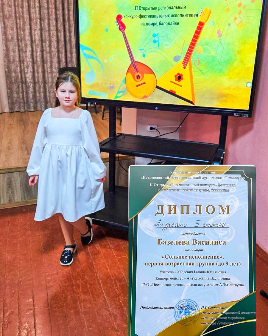 Ученица Поставской школы искусств имени А. Тизенгауза Василиса Базелева на II Открытом региональном конкурсе исполнителей на домре и балалайке в Новополоцке награждена дипломом лауреата III степени.