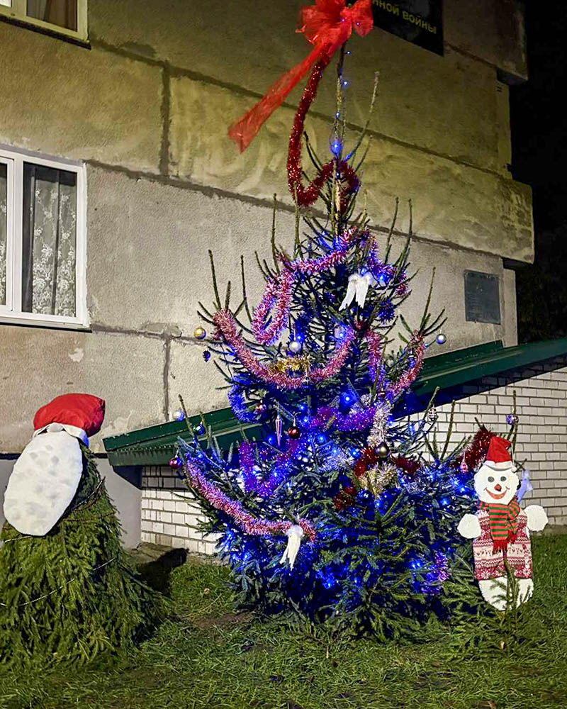 А к католическому Рождеству вход в этот подъезд засветился разноцветными огоньками гирлянд. На крылечке поселился самодельный весёлый гном, появились праздничные украшения на перилах, шикарный красный бант украсил входную дверь. А открываешь её — и попадаешь в новогоднюю сказку: в одном углу комфортно себя чувствует красивый снеговик, в другом жильцы разместили имитированные новогодние подарки. А на газоне на улице — нарядная живая ёлка. Как было не поинтересоваться, кто создаёт такую красоту, а вместе с ней и праздничное настроение? Позвонила Виктории Сениной, с которой знакома.